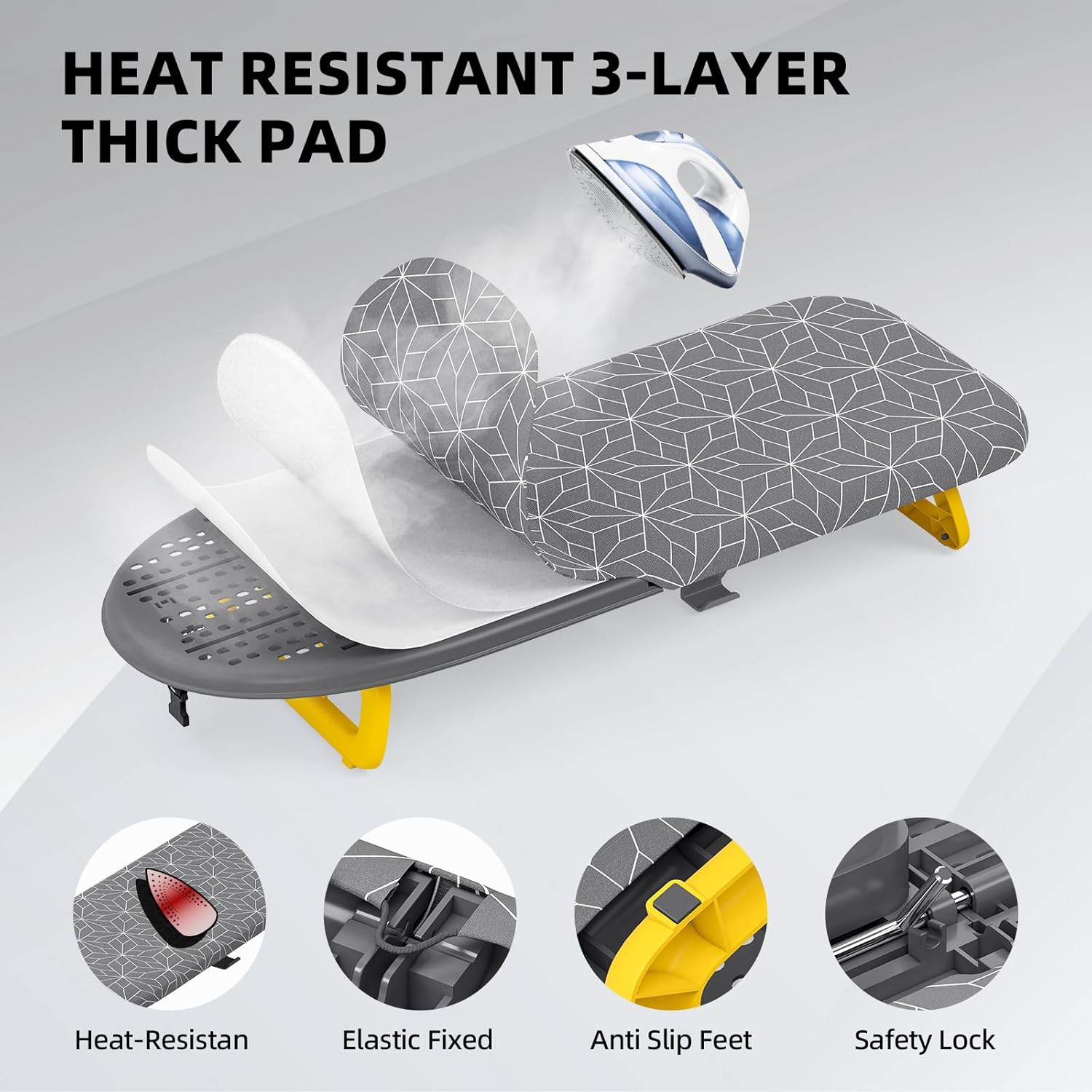 - [Detachable & Heat-Resistant Covers]Equipped with thick 100% cotton cover and soft felt padding, our mini ironing board ensures excellent ventilation and smooth ironing. The covers of this compact portable ironing board can be detached for easy cleaning.