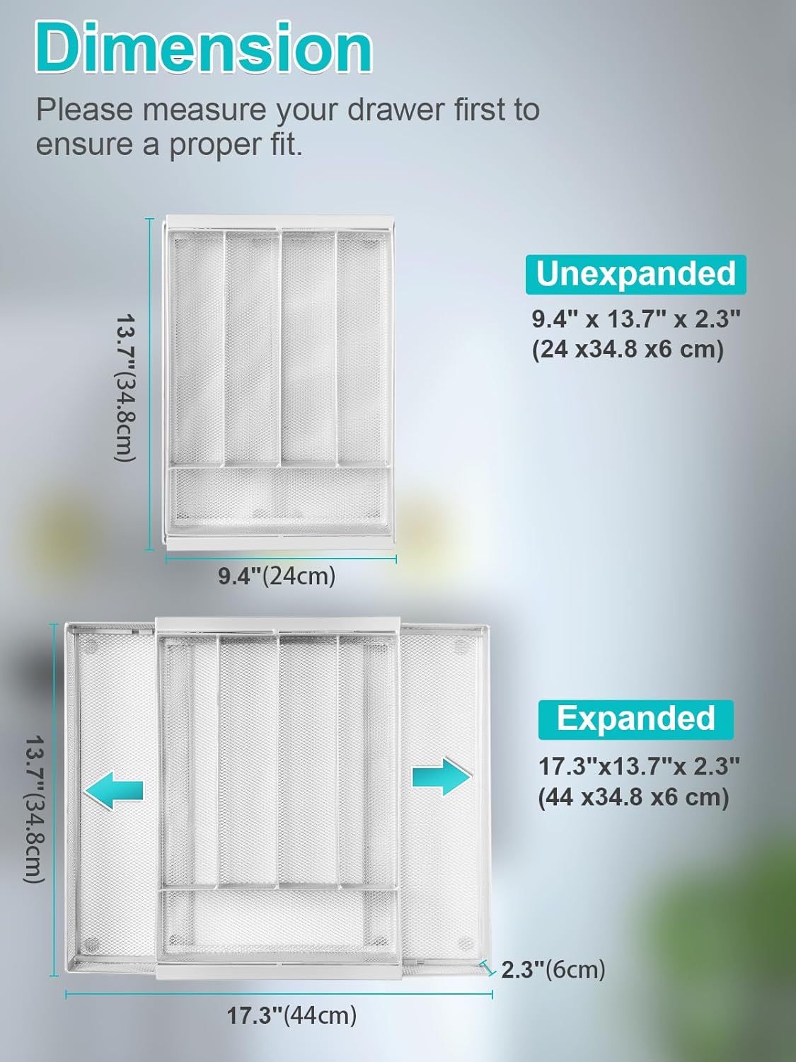 - Expandable Design: This Expandable Drawer Organizer Easily Adjusts From 5 to 7 Compartments, with a Width That Expands From 9.4" to 17.3". It Saves Space While Fitting All Your Kitchen Essentials with Ease.