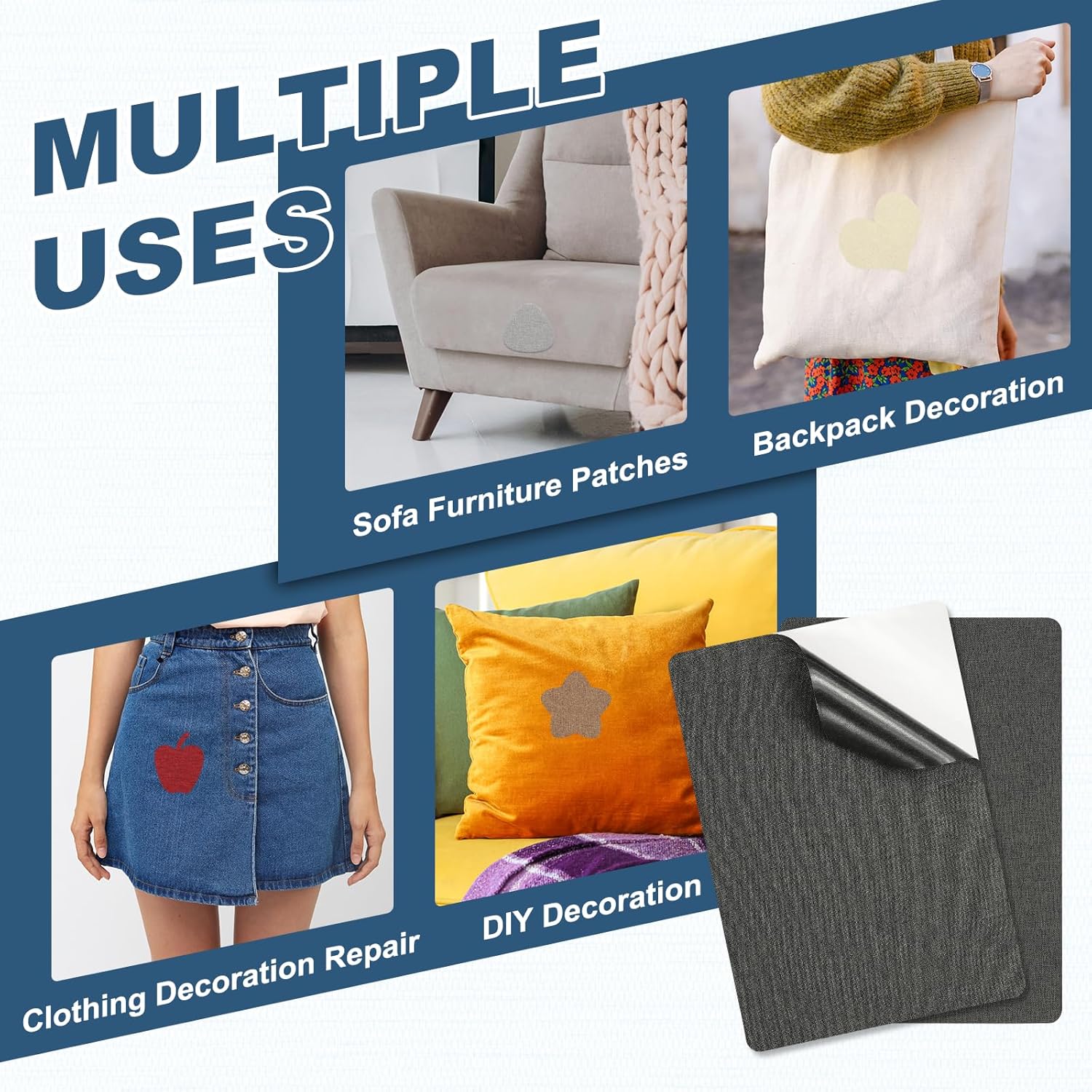 - Color: Grey; Material: Linen; Size: 280 x 205mm / 11 x 8 inch(L*W); Packing List: 2 x Fabric Patches Self Adhesive