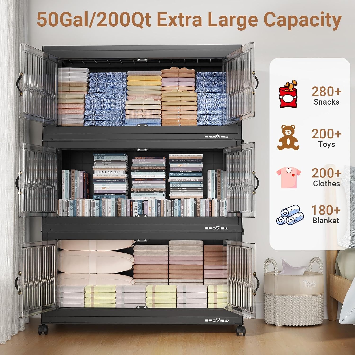 BROVIEW 800Qt Extra Large Stackable Storage Bins with Lid, Closet Organizer Collapsible Drawer Boxes with Wheels, Folding Plastic Cabinet Containers for Home Kitchen Room Organization, 4Pack Black