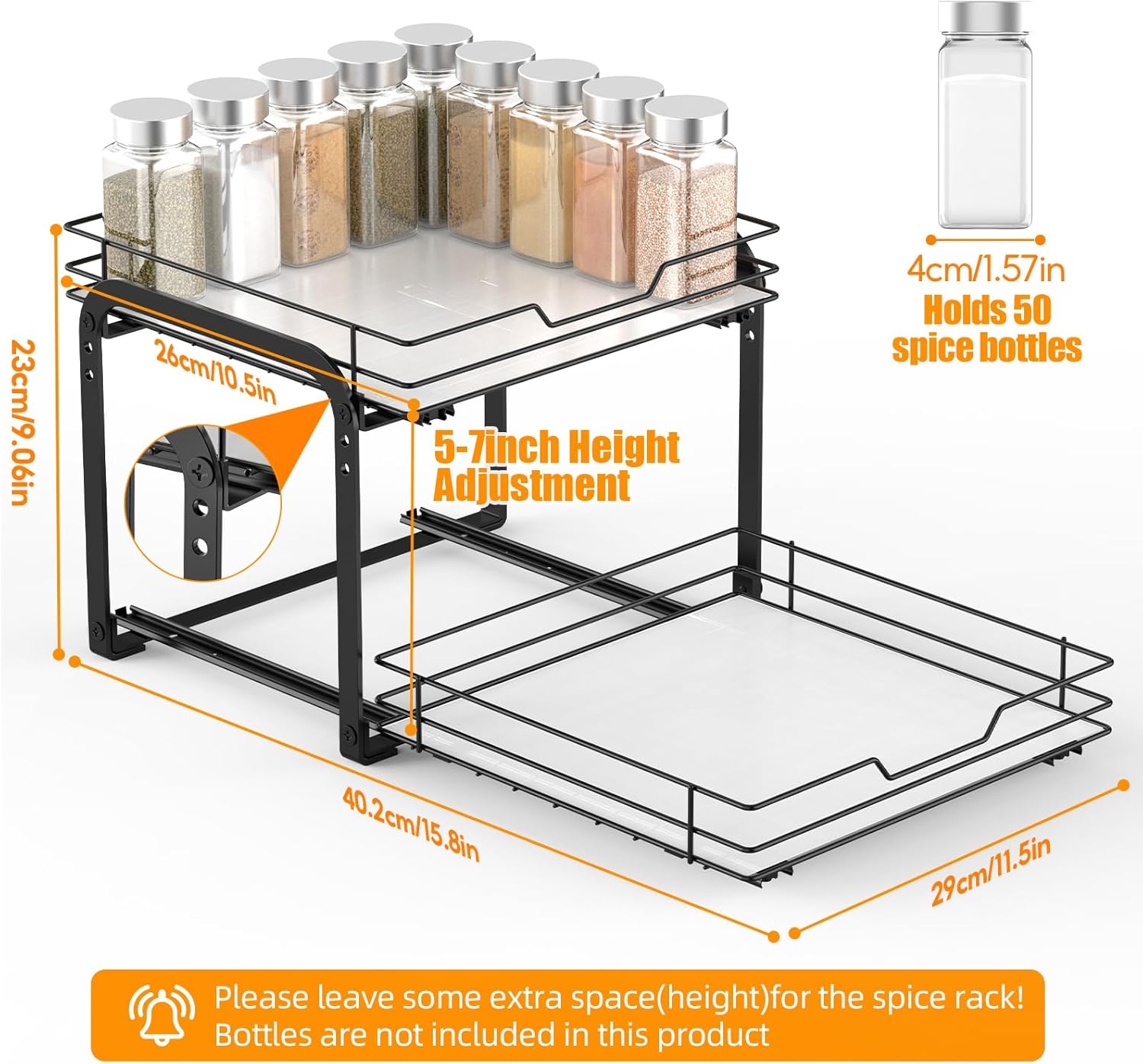 - Double-Tier Pull-Out Design for Maximum Storage: Maximize your cabinet or pantry space with our vertical spice rack pull out. The 2-tier design lets you store up to 50 spice jars (jars not included with this product), keeping your kitchen countertops clutter-free and your spices within easy reach. Each tier pulls out independently, so you get unobstructed access to all your items.