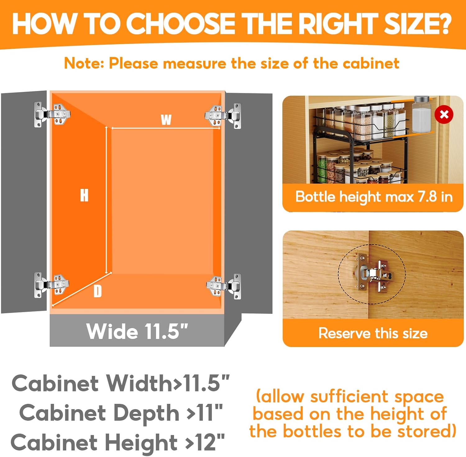 - Important Note: The cabinet spice organizer does not fit framed cabinets. The pull-out spice rack for cabinets requires a cabinet with a width exceeding 12", depth exceeding 11", and height exceeding 9.5". Before installation, carefully measure your cabinet's dimensions.