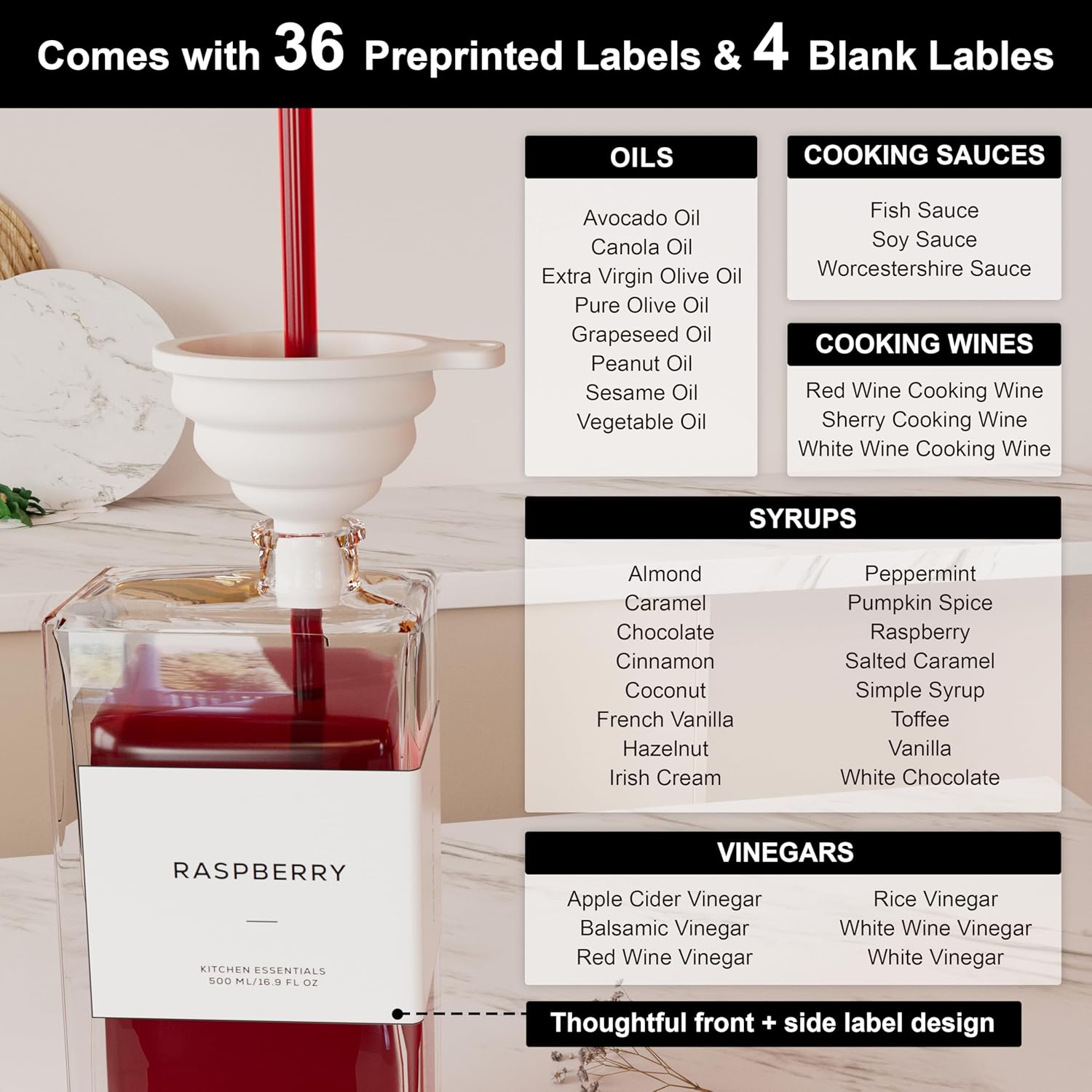 - Modern Kitchen Essential: Elegant and minimalist olive oil dispenser bottle include 2 high-quality 16.9 oz (500 ml) glass bottles, 2 weighted self-closing spouts, 2 Silicone Dust-Proof Oil Spouts, 1 funnel and a set of 40 labels, making them a must-have for any kitchen. Practical and decorative for your kitchen counter, these cooking oil dispenser meet all your kitchen needs for style and functionality!