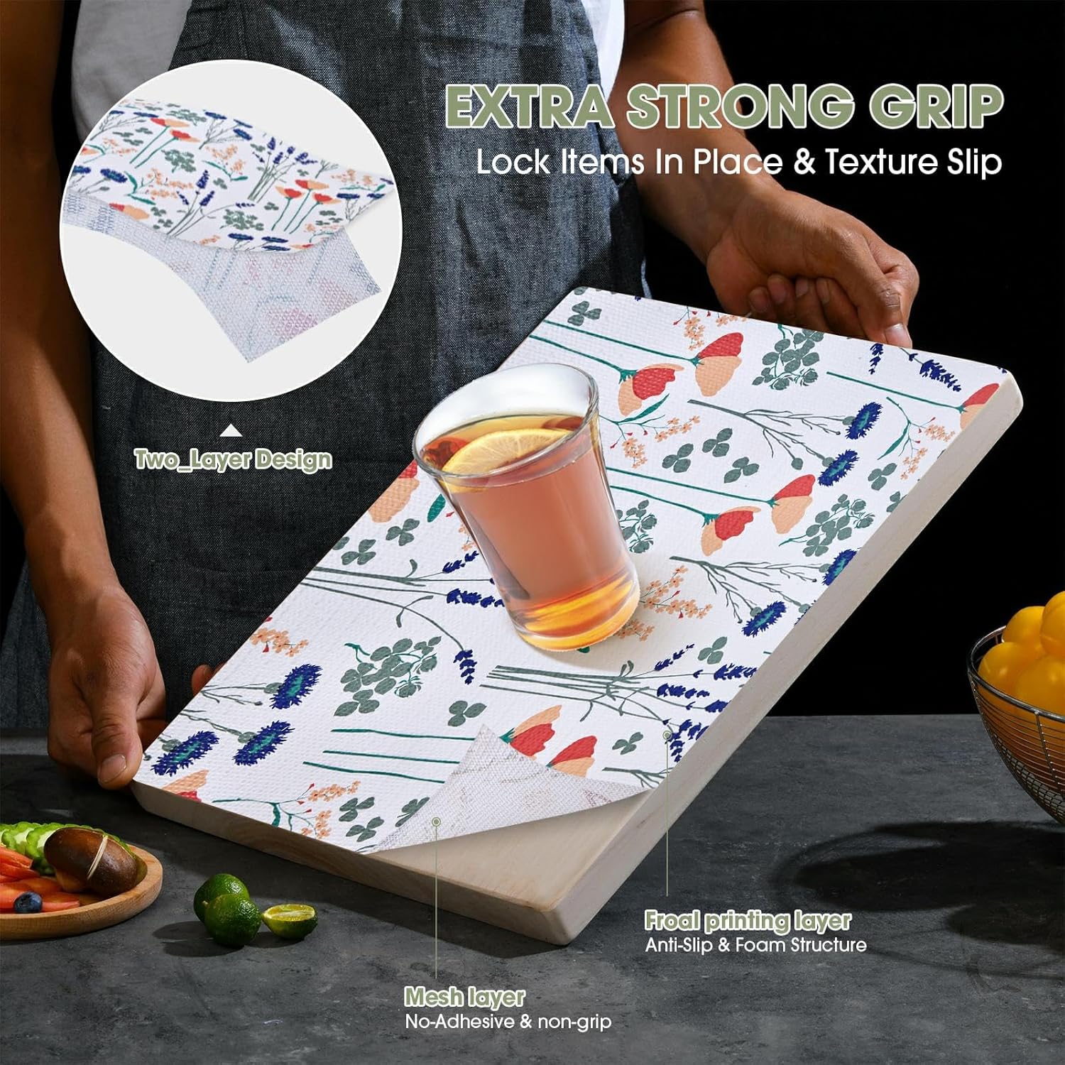 - Floral Shelf LinerăLock Items in Place, Strong Gripă Engineered with premium, thick 1.2mm BPA-Free & Odorless and food-safe PVC material, the EAQQWWY kitchen liner features a double-sided, heavy-duty textured grip. Its superior friction technology locks dishes, jars, and kitchenware firmly in place, preventing slips and shifts even during vibrations or drawer movement. The tear-resistant, crush-proof design offers dual protection: safeguarding your valuables and cabinet surfaces from scratches, scuffs, and stubborn stains.