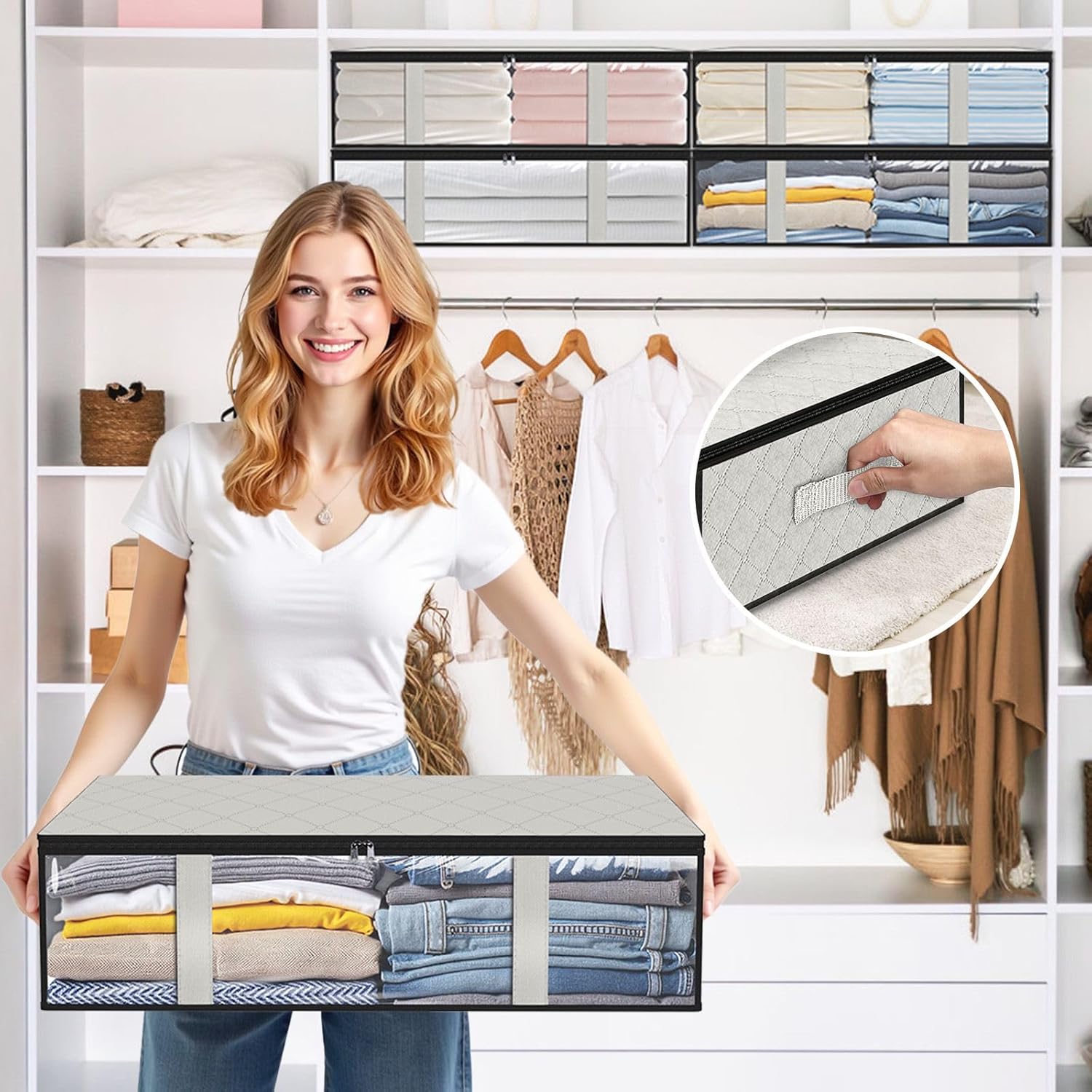 - Reinforced Handles:The sturdy stitched handles are convenient to pull the storage bag and to carry easily. On each side of the storage bag so it is convenient to pull the clothes storage out from under the bed