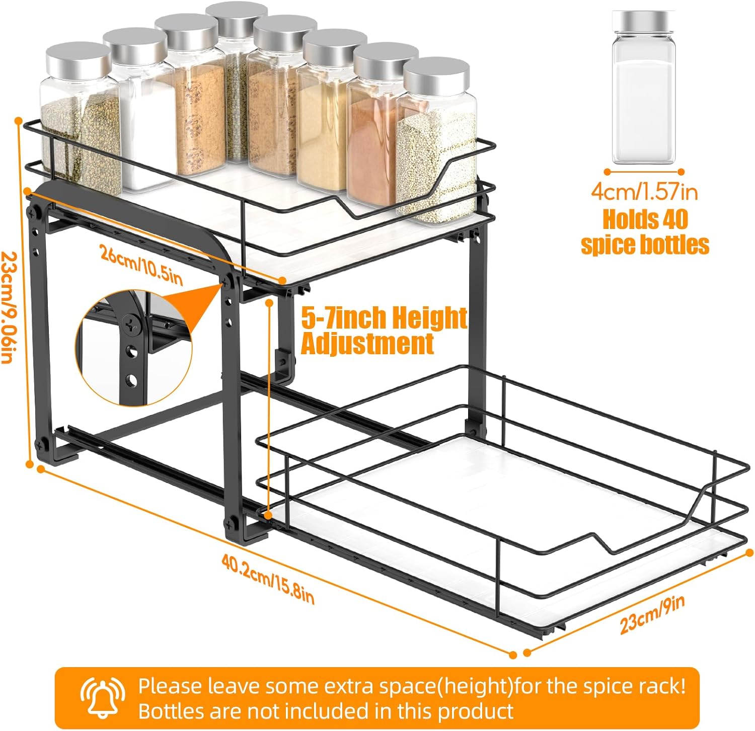 Spice Rack Organizer for Cabinet, 2 Tier Vertical Pull Out Spice Rack – Heavy Duty Metal Spice Organization for Cabinet, 40-Jar Capacity, Height Adjustable Cabinet Organizer (9"W×10.5"D×9"H, Black)