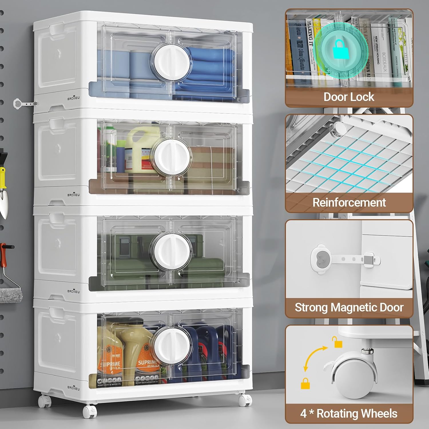 BROVIEW 360Qt Lockable Stackable Storage Bins with Lids, Closet Organizers and Storage Drawer, Collapsible Storage Bin with Wheels, Plastic Cabinet for Toy Clothes Dorm Organizer, V9 3 Pack White