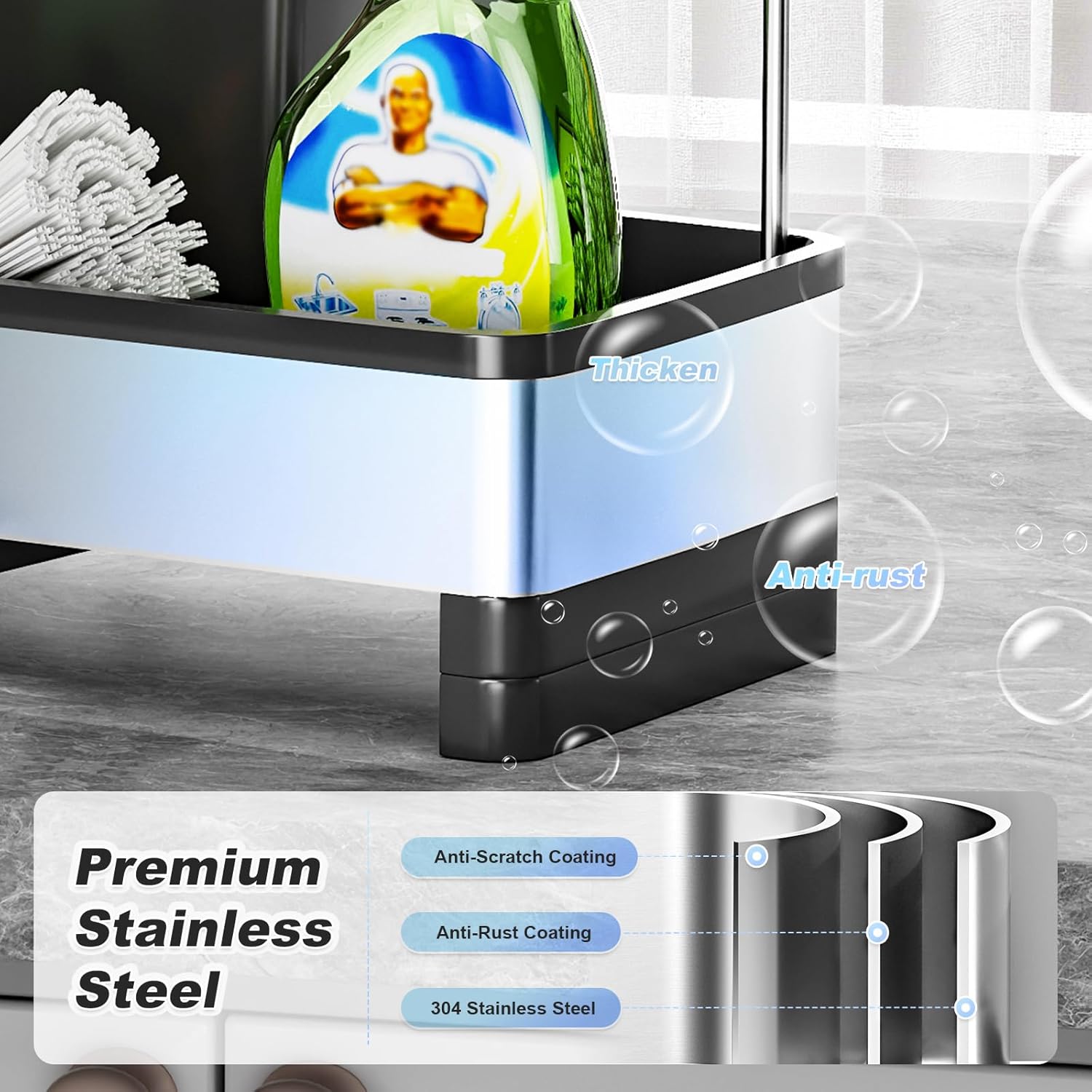 - ăPremium Stainless Steel MaterialăThe kitchen sink caddy is made of high-quality stainless steel material,effectively preventing rust and deformation. It is easy to clean and highly durable. Its appearance features a stylish metallic texture, resistant to fingerprints and stains. The bottom of the sponge holder has anti-slip rubber to protect the countertop from scratches.