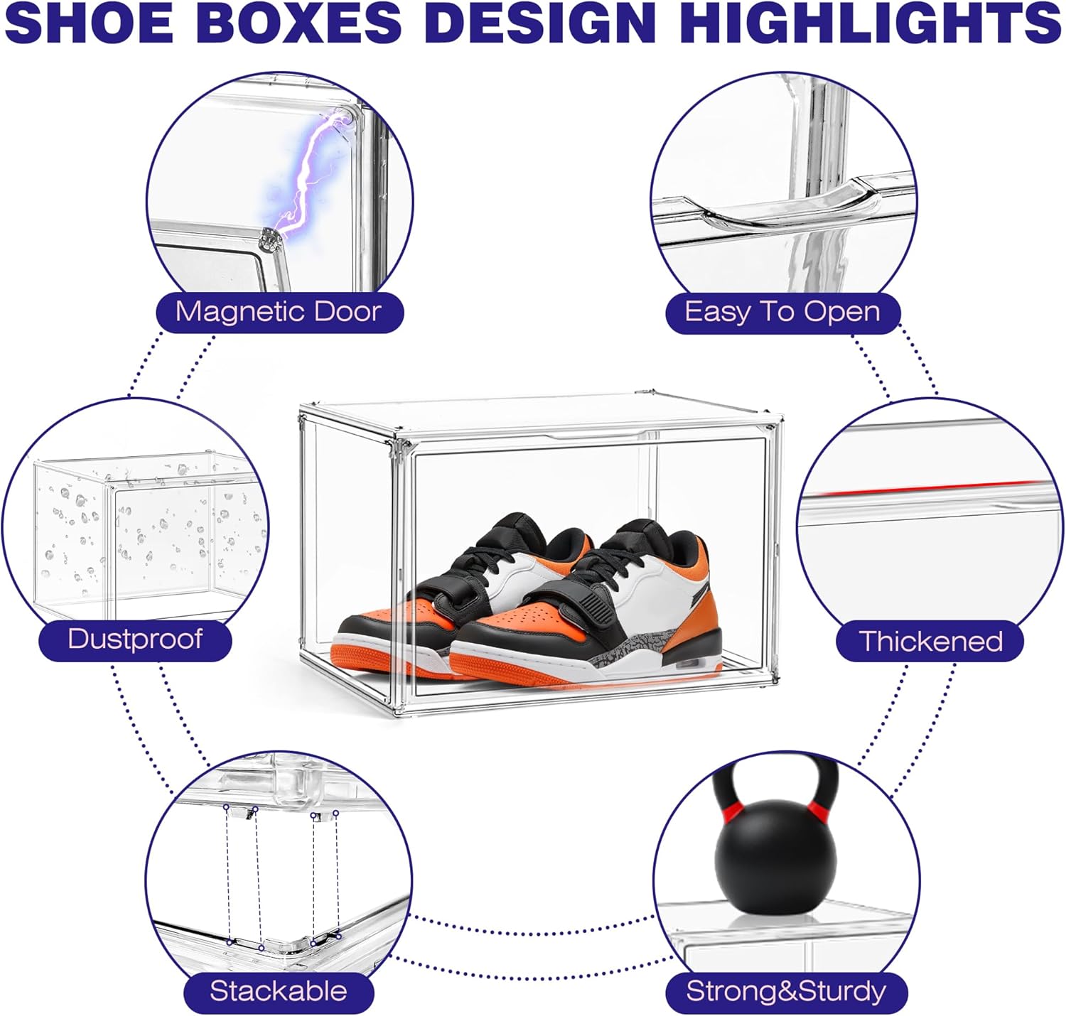 Shoe Storage 6 Pack, Acrylic Clear Shoe Storage Box Stackable Large Sneakers Display Case with Magnetic Door Hat Boxes Shoe Organizer for Closet, Fit up to US Size 13