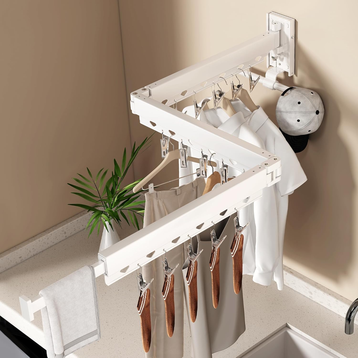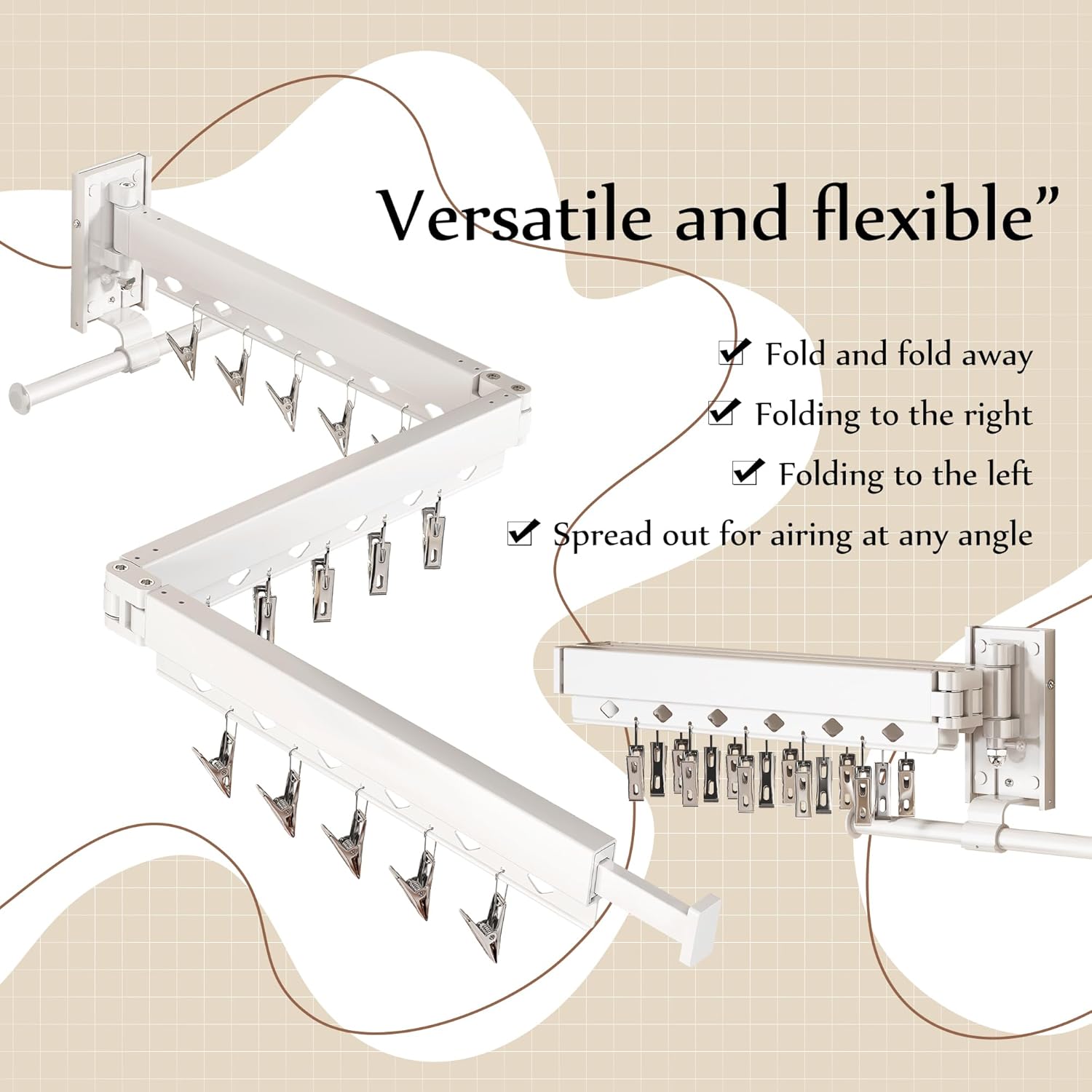 - Windproof Design with Clips & Holes: Equipped with 18 windproof holes and 15 clips, this upgraded wall mounted clothes drying rack keeps clothes, socks, and small items secure even on windy days, making laundry more convenient.