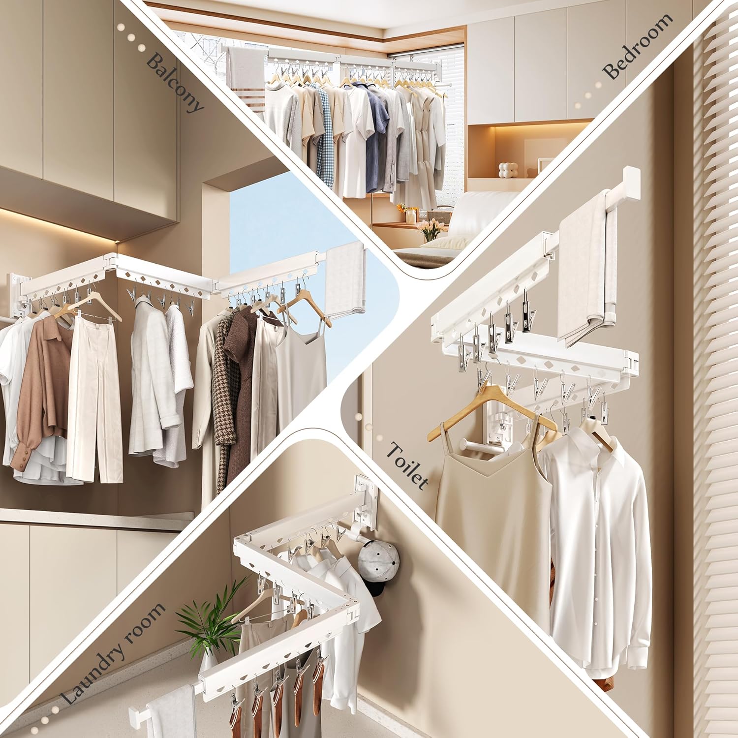 - Multi-Scene Application: Perfect for both indoor and outdoor use, this space-saving clothes hanger can be installed on balconies, patios, laundry rooms, or bedrooms, adapting to all environments.
