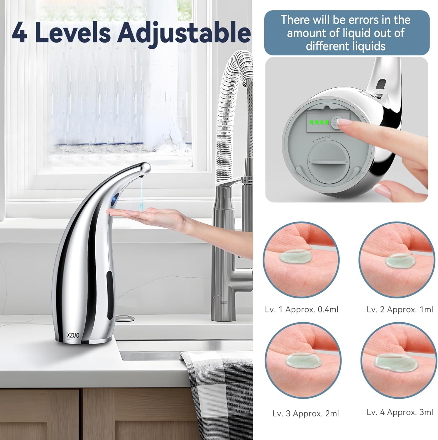 Automatic Soap Dispenser with Infrared Sensor - Adjustable 4-Level Touchless Hand Soap for Kitchen, Bathroom - Battery Operated Electric Dispenser, Durable Plastic, Smart Soap Holder (Silver)