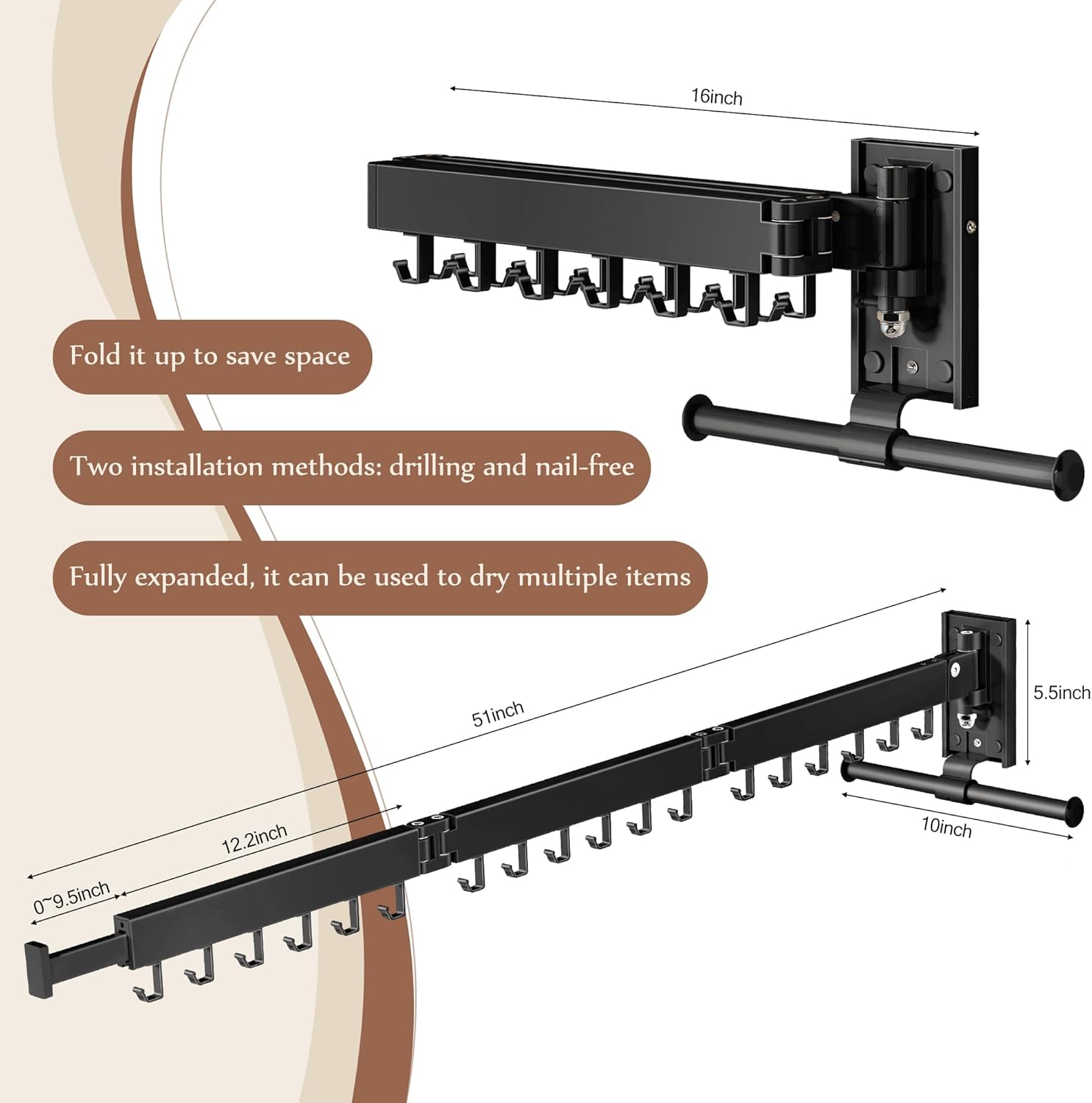 - Easy No-Drill Installation: Hassle-free setup with a simple wall-mounting system β no need to drill holes in your wall. Enjoy the convenience of a collapsible drying rack.