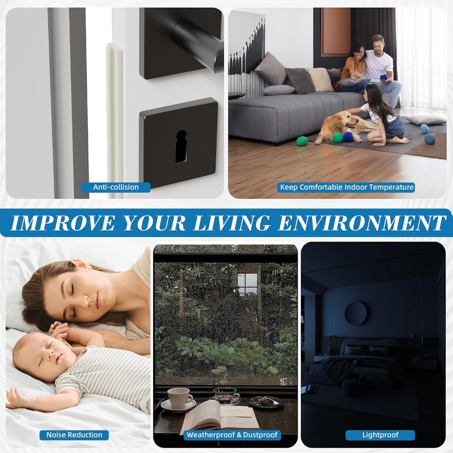 - Multi-Purpose Design: This window insulation is the perfect solution for sealing gaps around doors and windows with ease. Whether it’s winter or summer, our door weatherstripping acts as a reliable barrier to lock in hot or cold air—boosting heating and cooling efficiency while cutting down on energy bills. What’s more, it effectively blocks out noise, light, rain, dust, wind, leaves, snow, and odors, and even keeps unwanted pests from sneaking in.