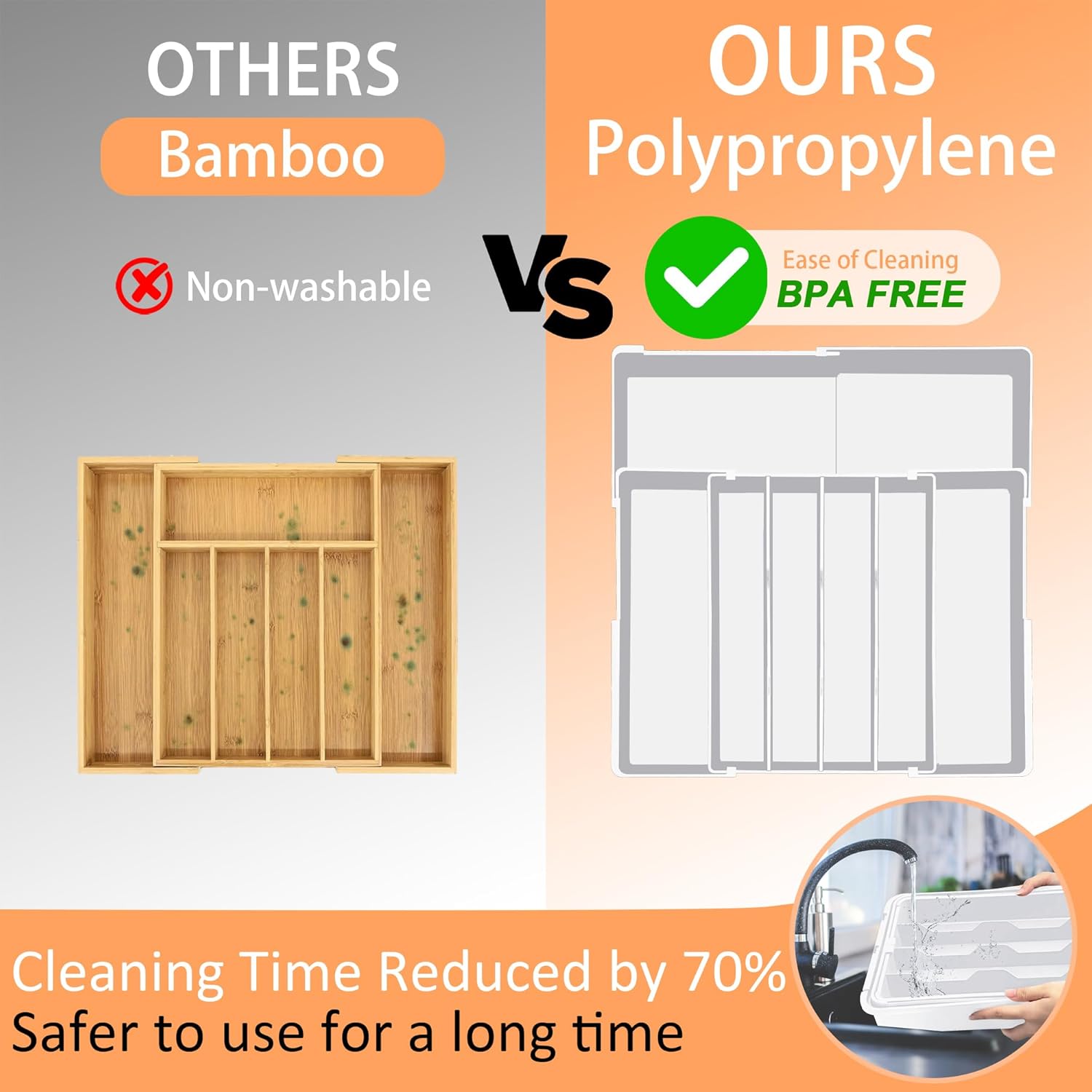 - ăPremium Food Grade Material for Safetyă: Crafted from thick, sturdy food-grade PP material, our utensil drawer organizer is built to last. Itâs also BPA-free, ensuring that your kitchen utensils stay safe for your familyâs health. Cleaning is a breezeâsimply rinse with water or wipe with a cloth. Just avoid the dishwasher to keep your flatware organizer for drawer in top condition!