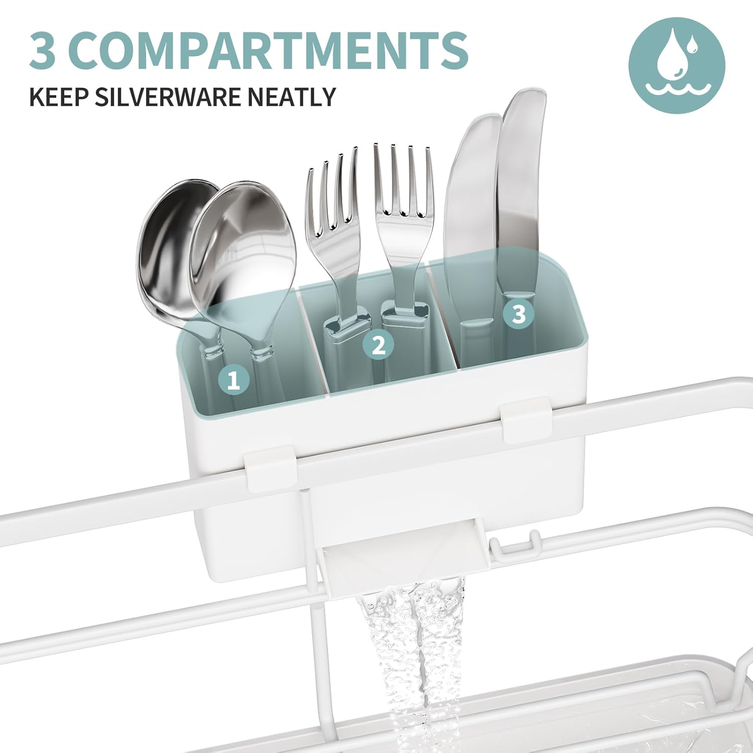 - 【External Cutlery Holder Save More Space】The white dish rack with hanging cutlery holder has a protruding drain outlet that can guide water to the drainage plate, saving more space. The cutlery holder of our large dish drying racks has 3 compartments to provide dedicated space for your forks, knives and spoons, keeping your cutlery organized