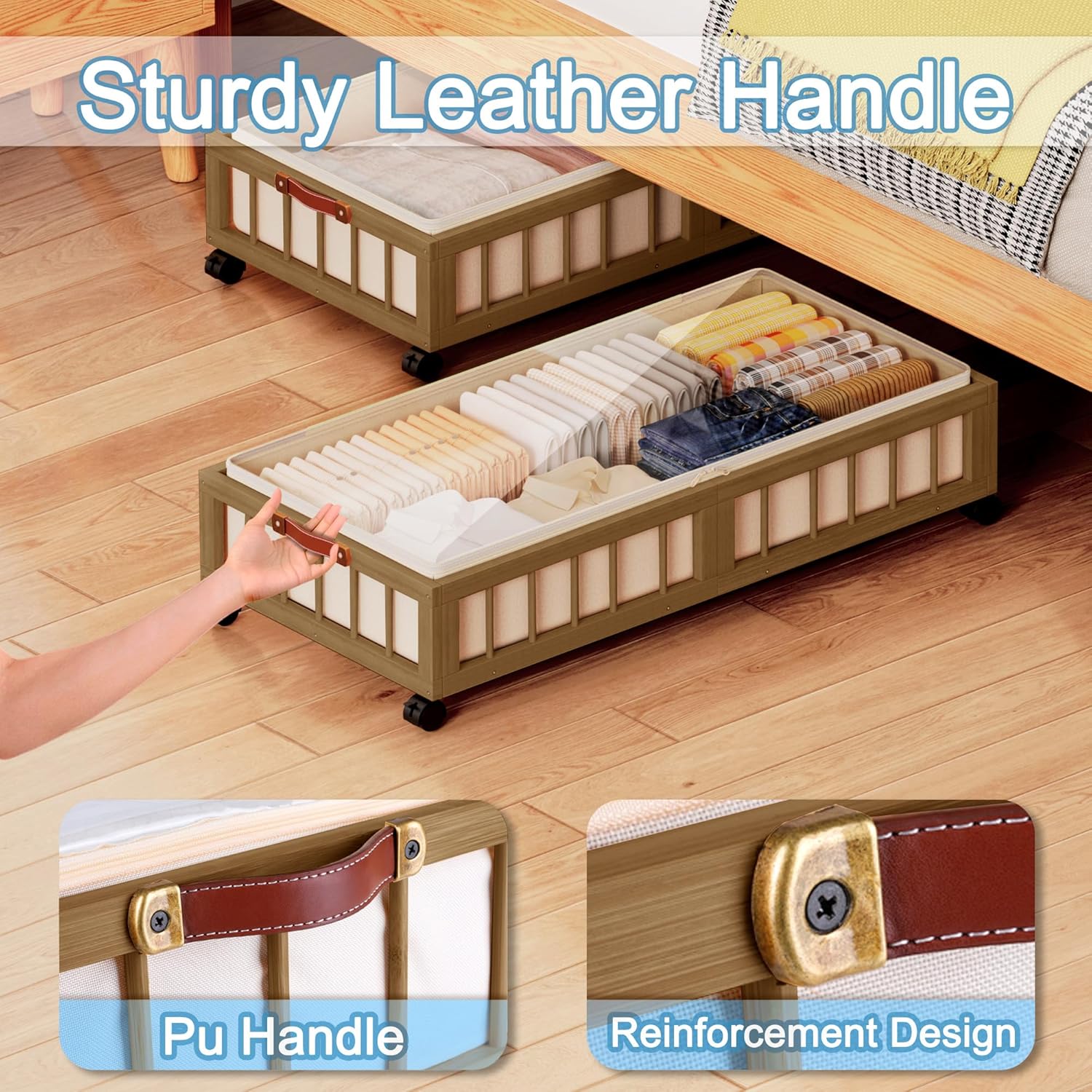 - 【Sturdy Leather Handle】 The under-bed storage basket features a leather handle, making it easy to pull out from under beds, sofas, or tables. The durable leather ensures a comfortable grip and smooth handling.
