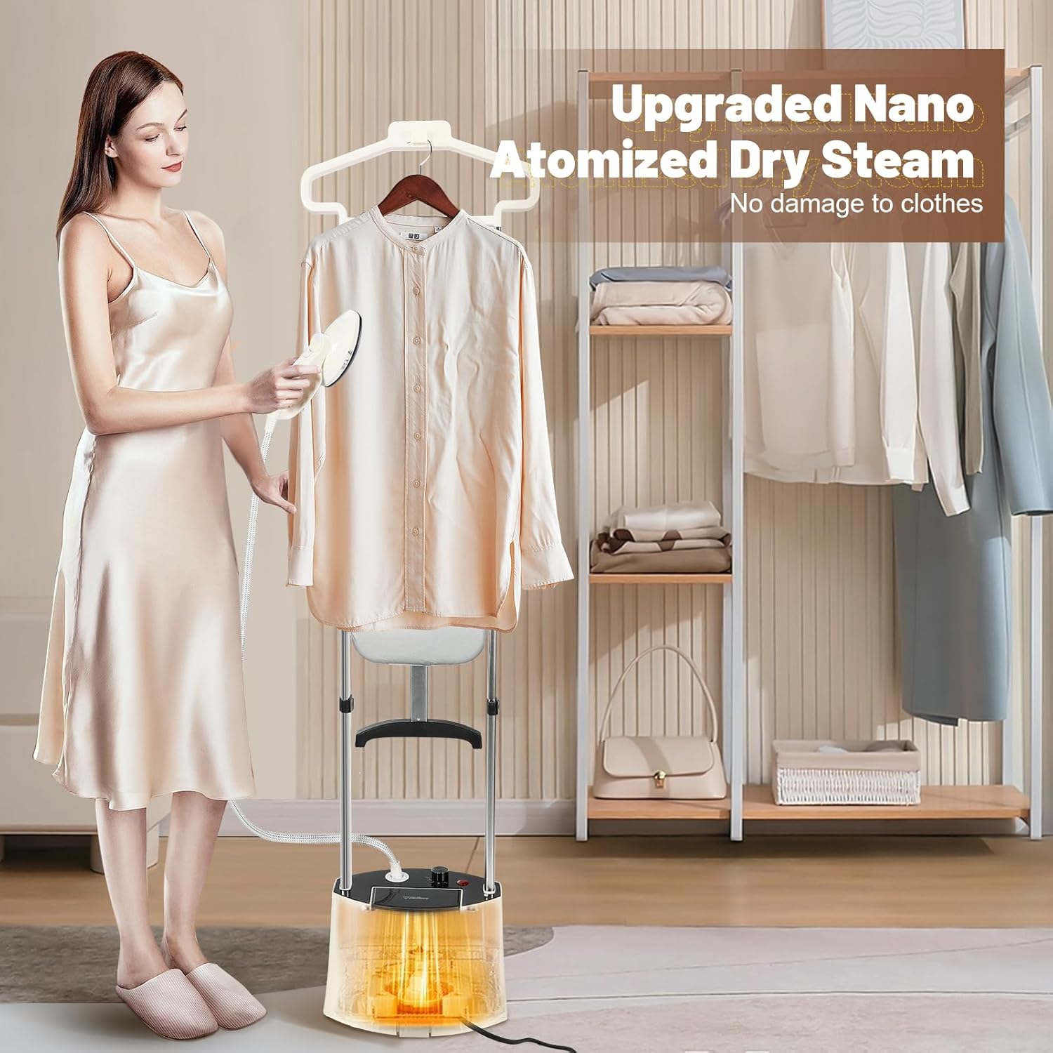 - Smart Features for Enhanced User Experience: Designed with intelligence in mind, this garment steamer includes a self-cleaning function, low water level alerts, built-in double overheating protection, and power failure alarms. Additionally, the bottom wheels provide easy mobility, making it convenient to use anywhere in your home