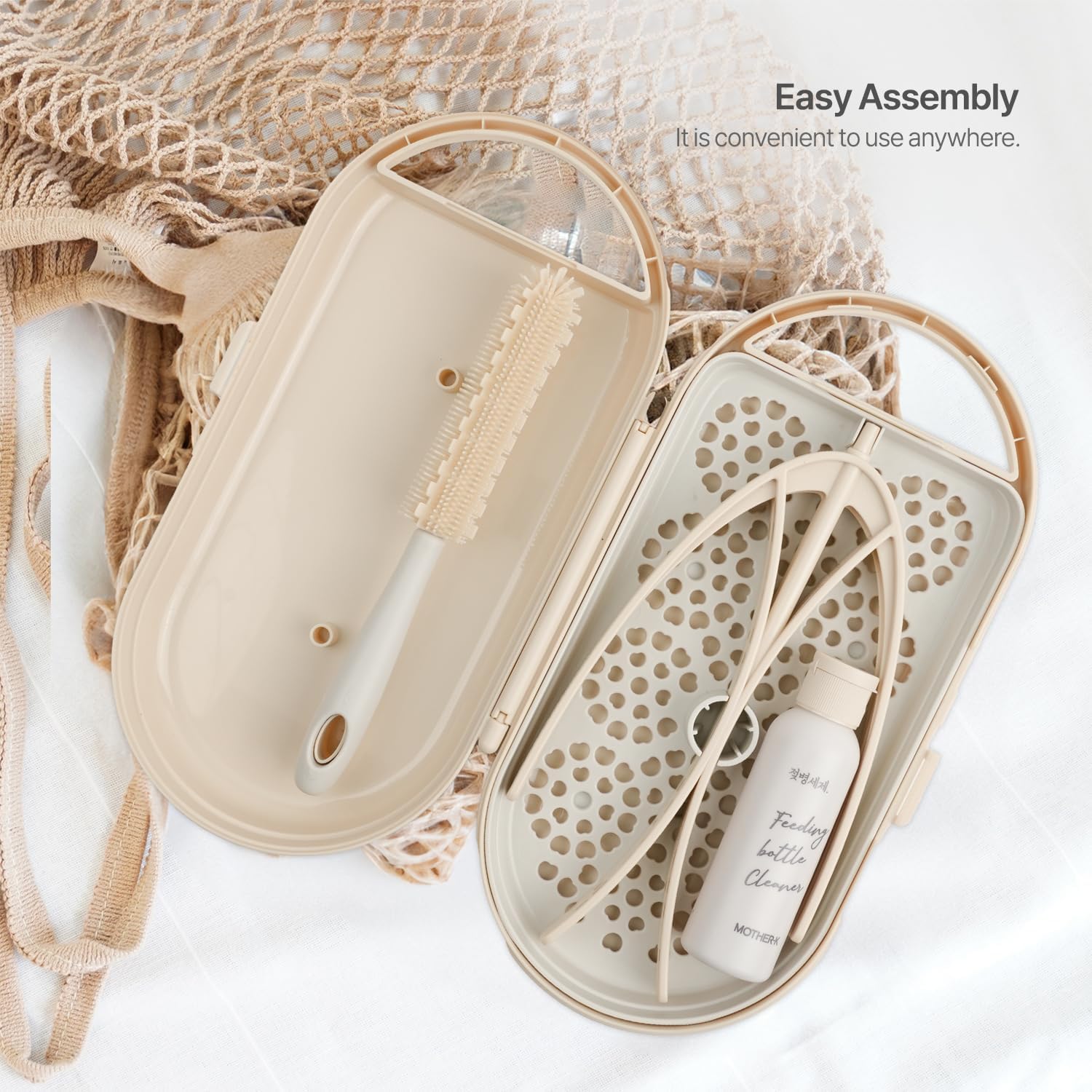 MOTHER-K Travel Baby Bottle Drying Rack Set - Baby Bottle Cleaner Kit with Mini Silicone Bottle Brush, Portable Bottle Drying Rack for Home and Travel (Cream)
