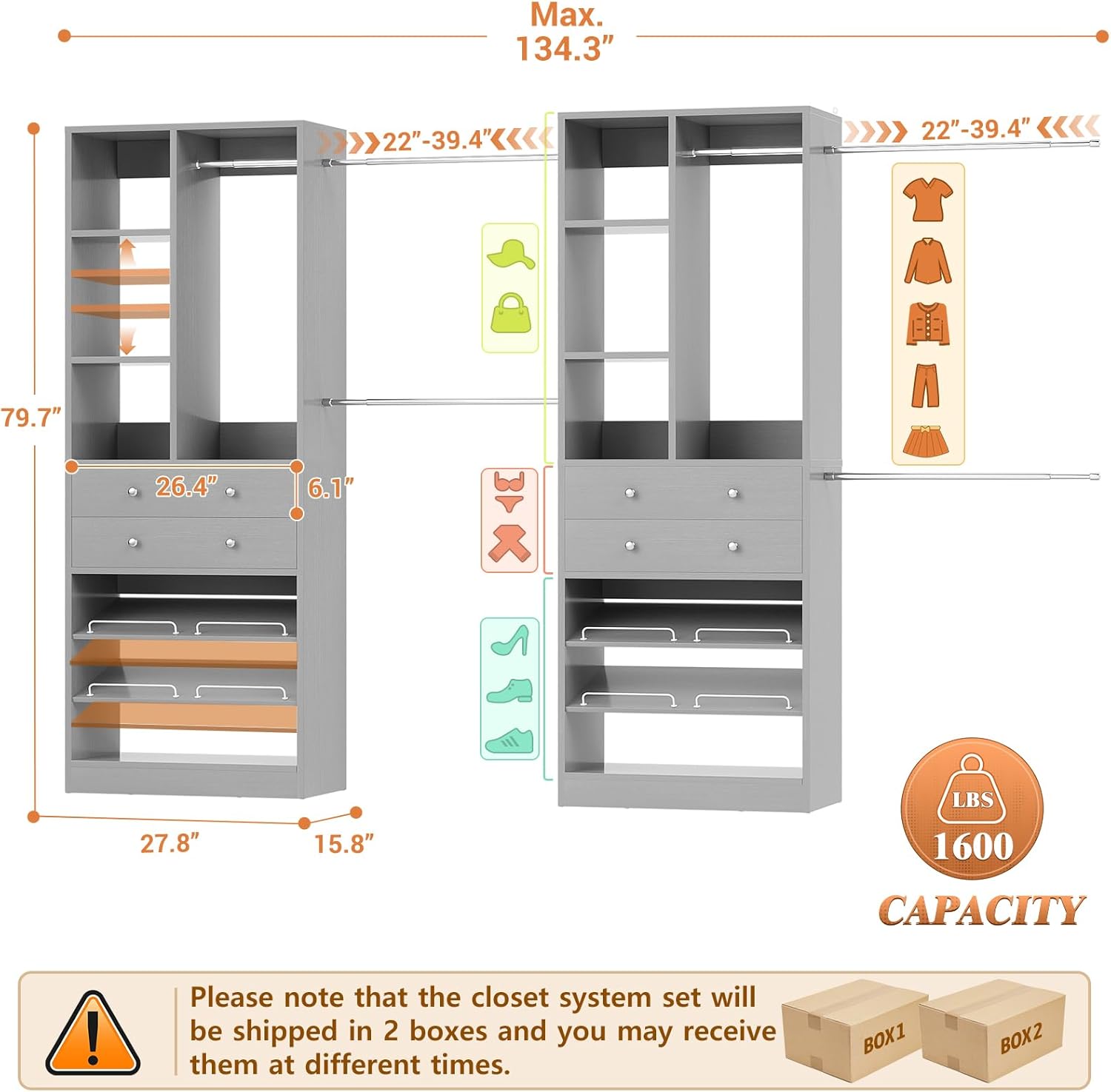 - 【Adjustable & Spacious Hanging Area】Equipped with 6 sturdy expandable hanging rods, this closet system offers ample space to organize your clothes. The rod length is adjustable, allowing for a flexible fit in closet spaces ranging from 77.6" to 134.4", making it perfect for various room sizes