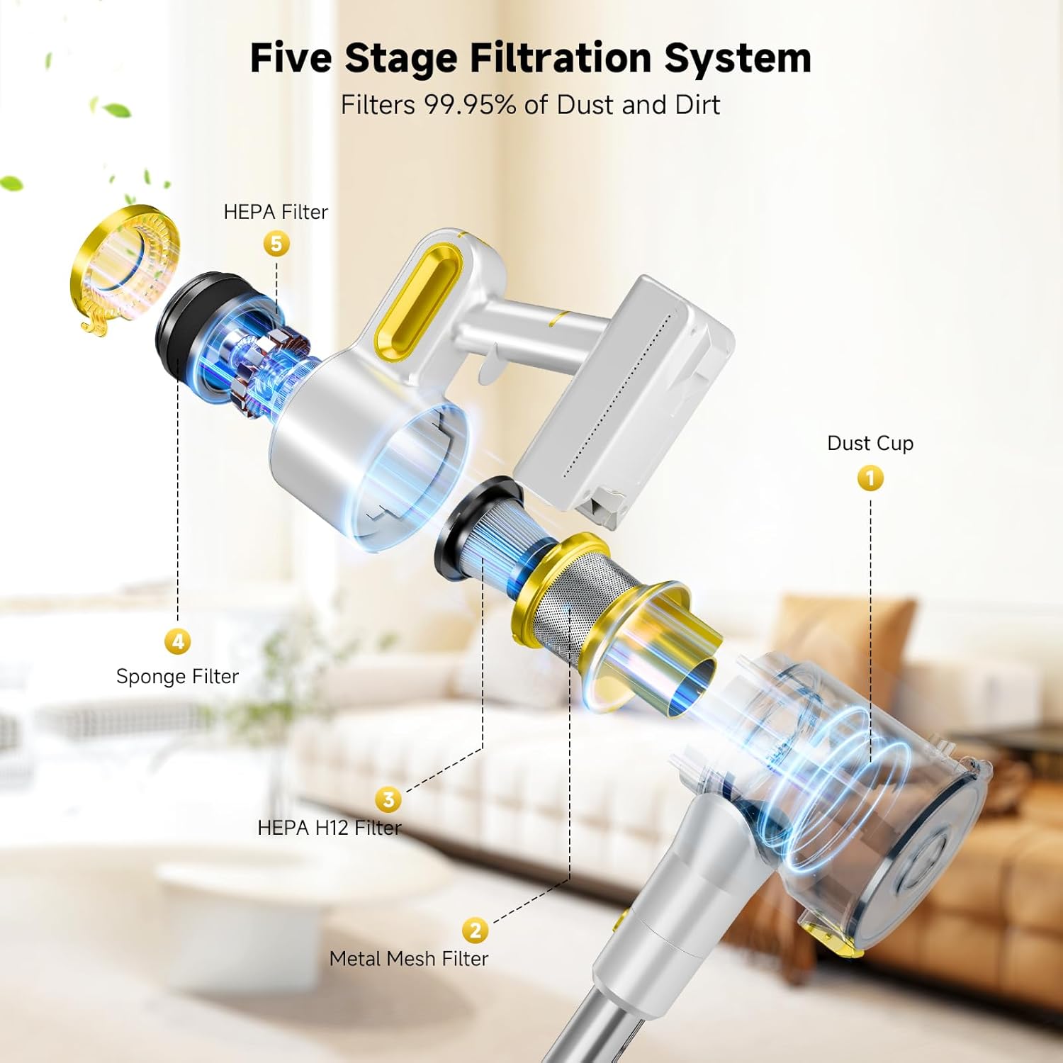 - 5-Stage HEPA Filtration System --- This stick cordless vacuum cleaner uses advanced dual-cyclone technology combined with a 5-layer filtration system, including HEPA filters at both the inlet and outlet, capturing 99.97% of particles as small as 0.03 microns. For best performance, clean the filters monthly and replace every 2–3 months to maintain strong suction