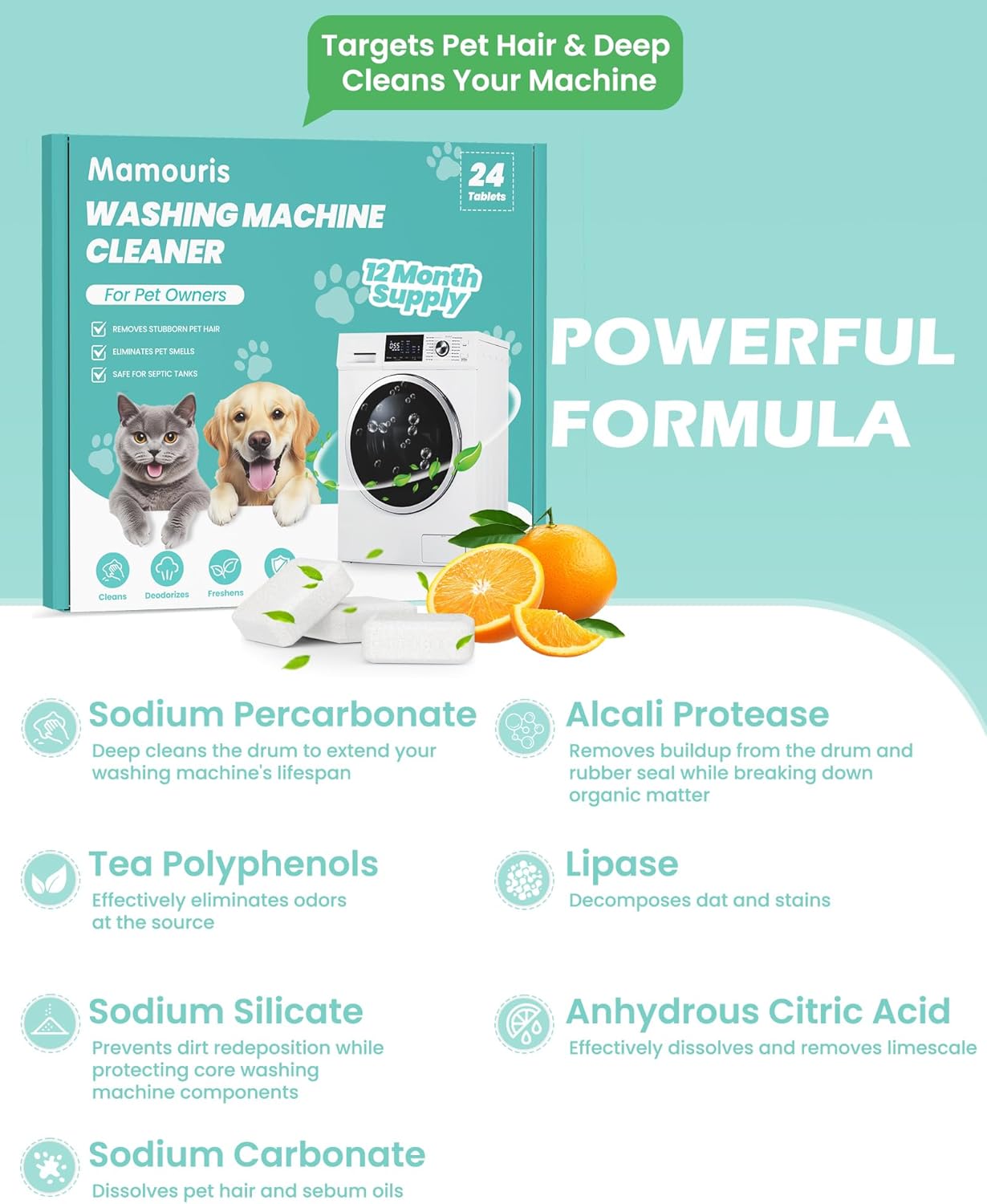 - Is Your Washing Machine Truly Clean? Over time, grime, detergent residue and pet fur build up deep within. Mamouris' upgraded Washing Machine Cleaner harnesses active enzymes to easily dissolve stubborn deposits and pet hair. From the drum to rubber seals, hoses to valves—it delivers thorough deep cleaning, restoring your machine’s original cleaning power