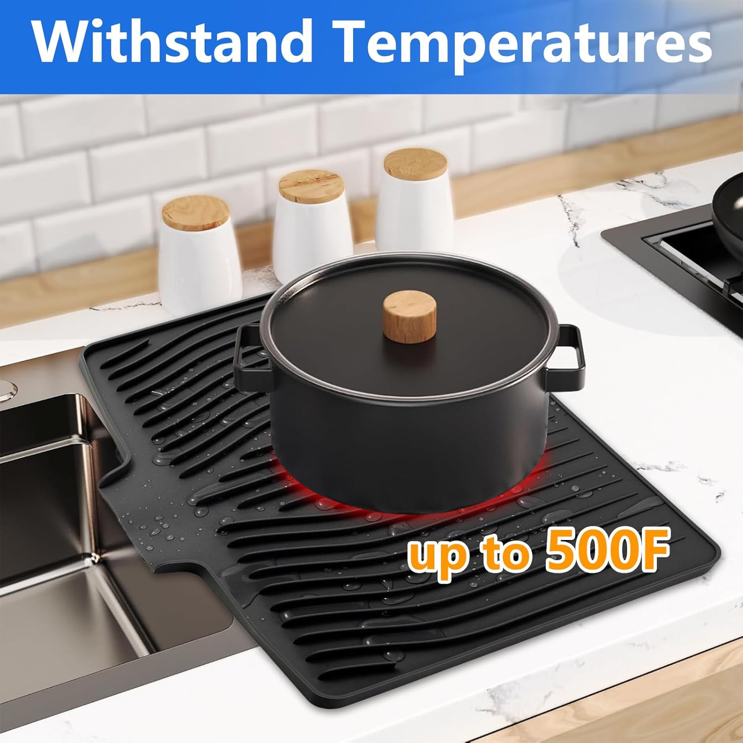 - Fast Drying: Silicone dish drying mats are designed with raised stripes to increase air circulation, which speeds up the drying process and allows your utensils to dry faster. The specially designed edges allow water to drain directly into the sink. This keeps your countertops dry