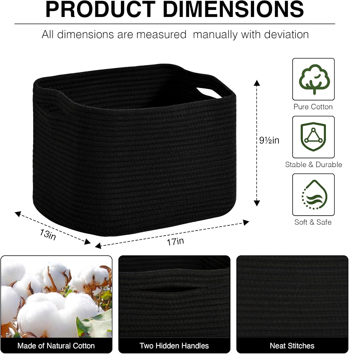 Woven Cotton Rope Storage Basket for Organizing, Cute Decorative Baskets for Gifts Empty, Organizer Bins for Dog Toy, Baby Laundry, 17“×13”×9.5“, Black