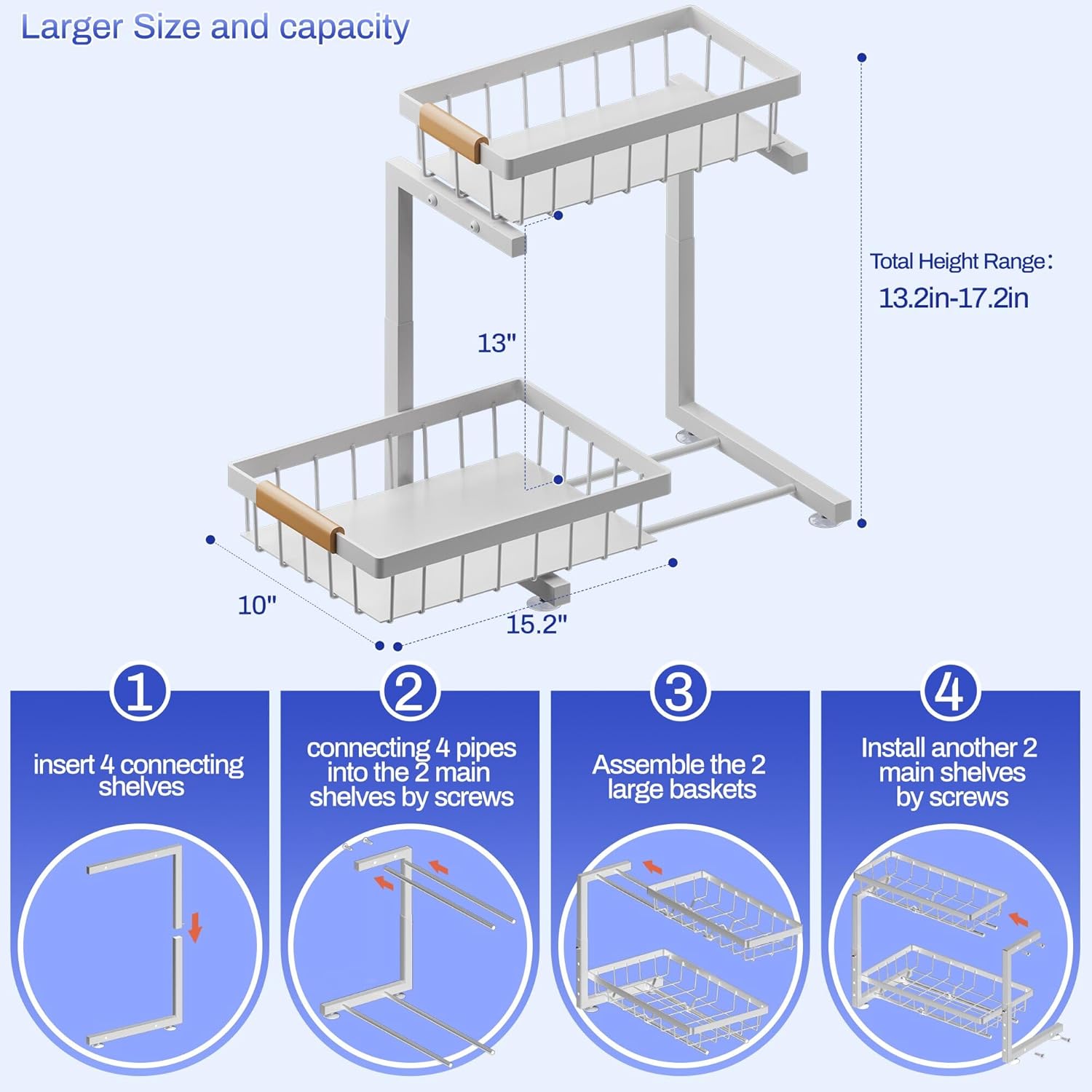 - ăDimensionsă15.2"L x 10"W x 13.2'' ïŒ 17.2''H. To fit most of the under-sink room, the total height of this Under Sink Organizer can be adjusted from 13.2 inches to 17.2 inches. Please measure your under-sink room before purchase to avoid unnecessary return.
