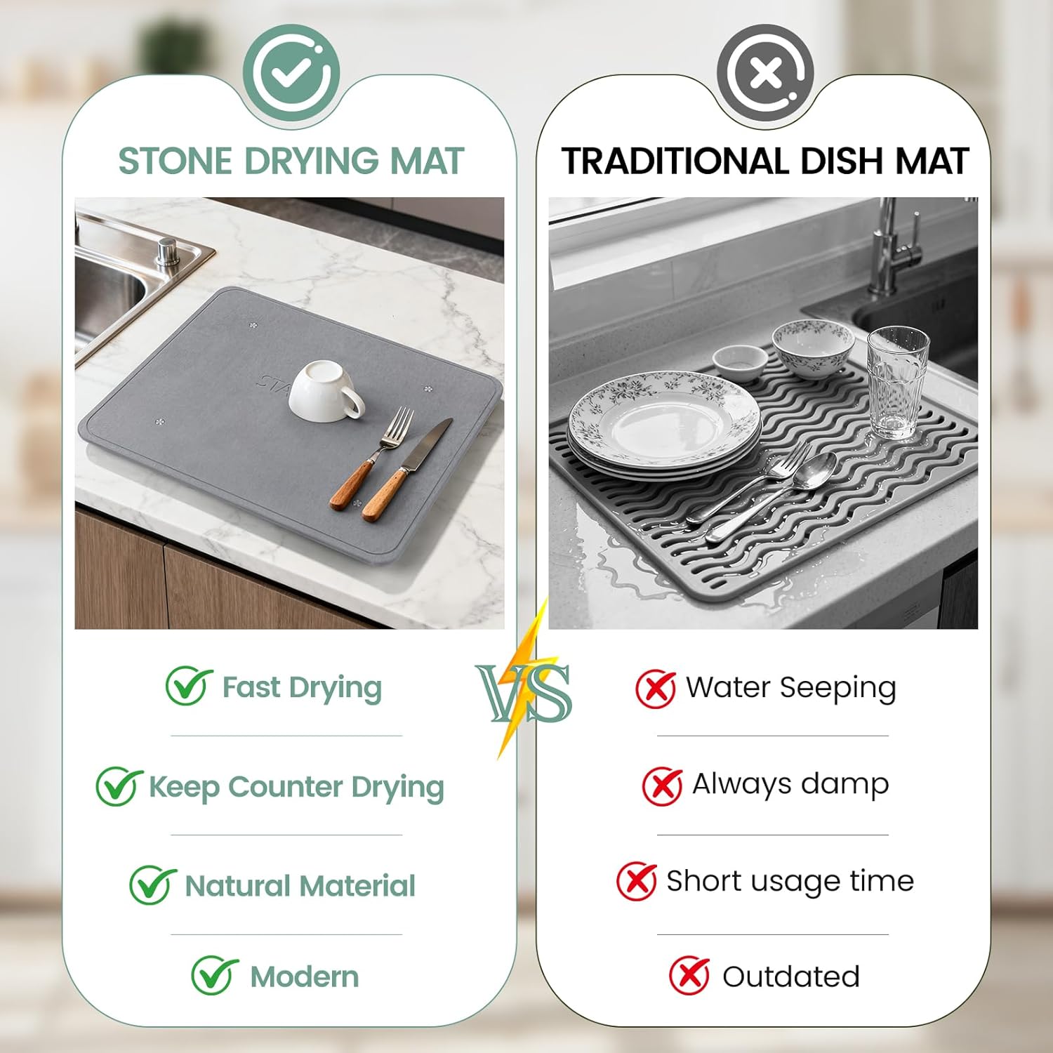 - SUPER ABSORBENT & QUICK DRY: Diatomaceous earth has strong water absorption and can quickly evaporate the surface water, Always keep countertop dry