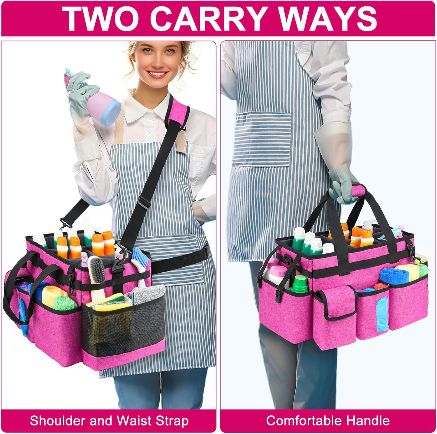 - Adjustable Shoulder Strap & Waist Strap: The cleaning caddy bag features an adjustable shoulder strap and waist strap, which can reduce stress for your shoulder and keep your body steady