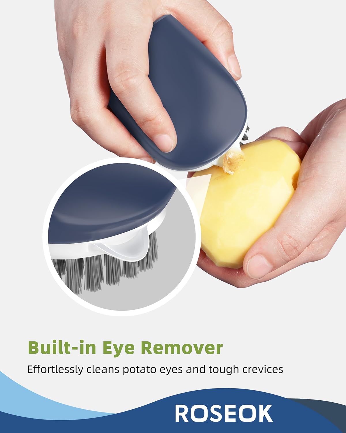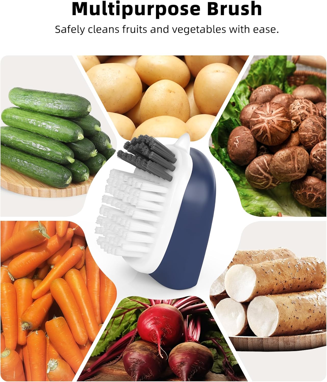 - Dual Bristle Design: Features soft gray bristles for delicate produce like mushrooms and firm white bristles for scrubbing potatoes and root vegetables. This versatile produce brush is perfect for everyday use.