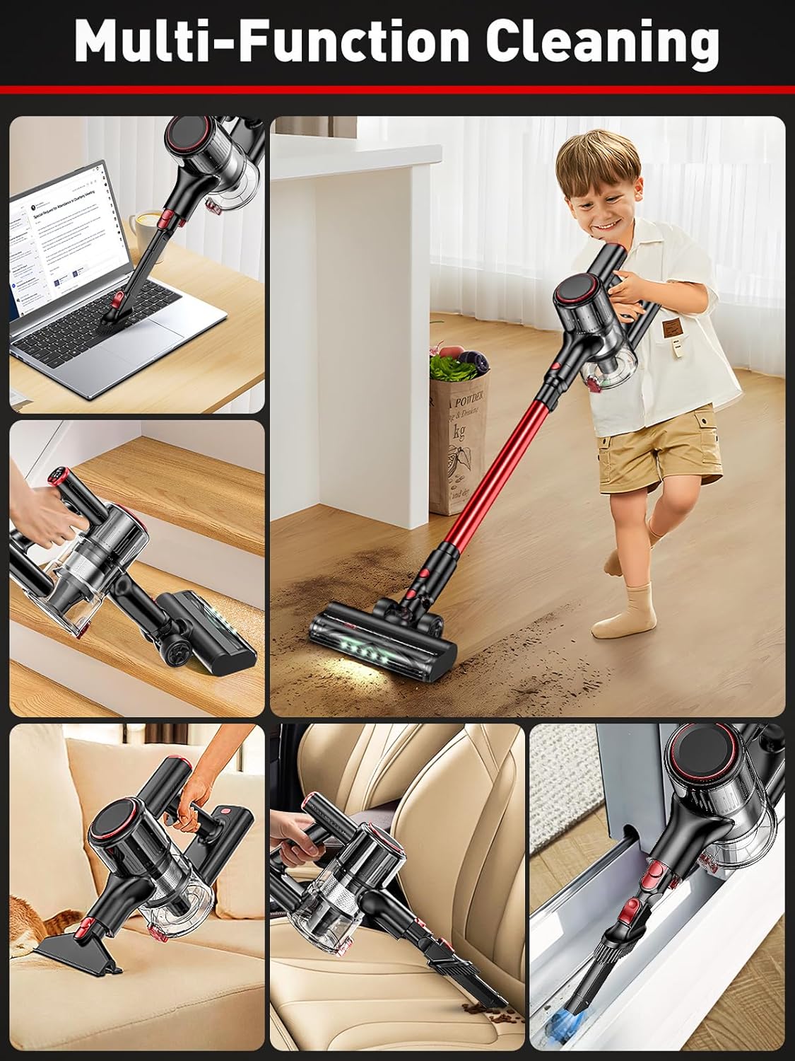 - [LED Display with Blockage Alerts] The intuitive LED screen shows battery status, suction level, and blockage alerts in real time. In order to prevent accidental touches, this cordless vacuum have designed user-friendly physical button switches and suction power adjustments.Keep your cleaning under control with just a glanceâperfect for busy families.