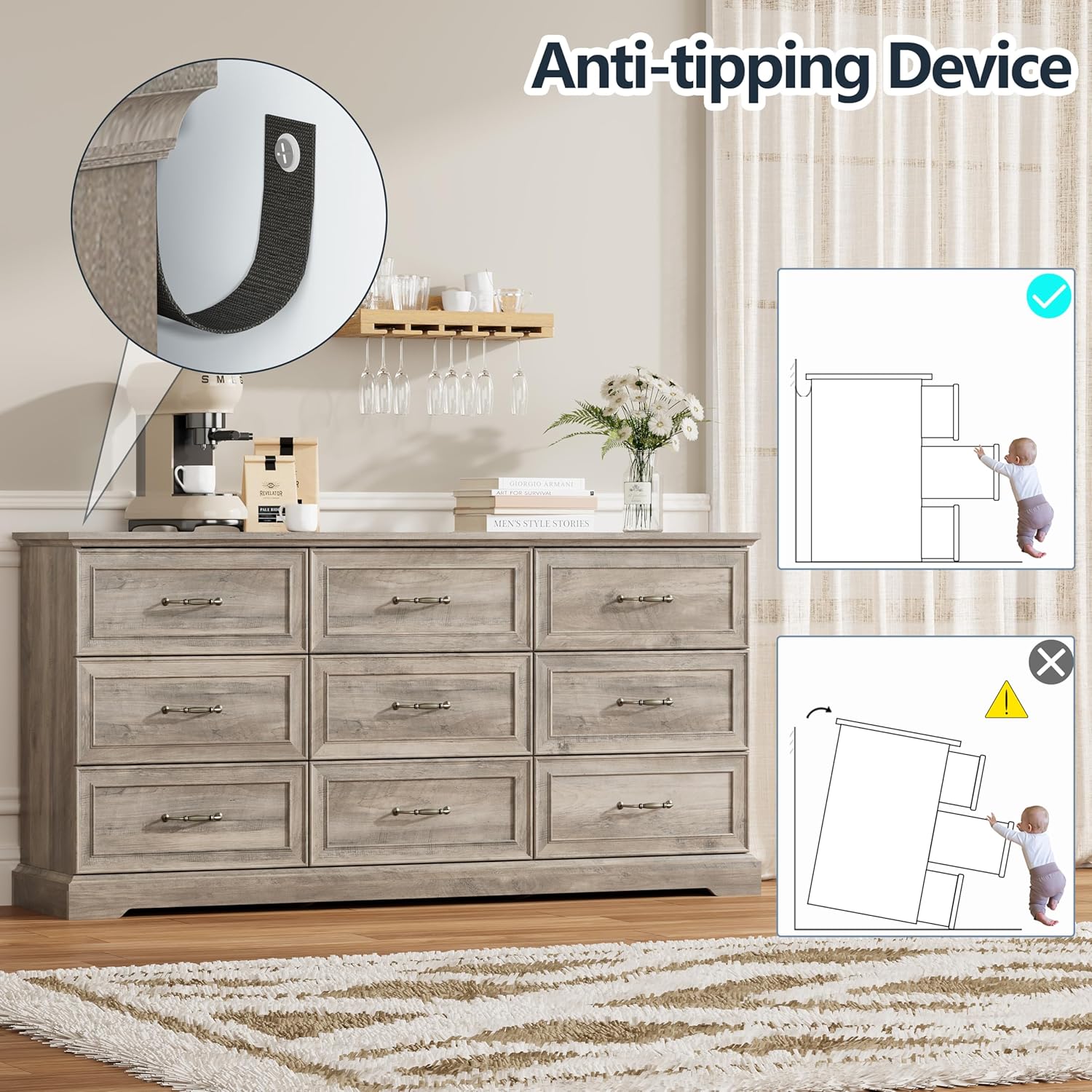 9 Drawer Dresser for Bedroom, 63" Wide Wooden Chest of Drawers, Rustic Farmhouse Dresser with Large Drawers & Metal Handles, Modern Storage Organizer for Closet, Living Room, Hallway, Grey