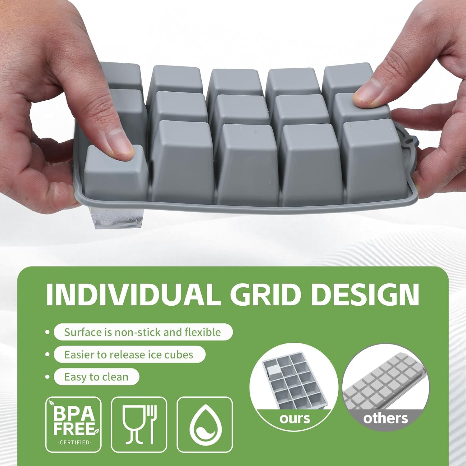 Silicone Ice Cube Tray, 2 Pack Easy-Release Stackable Ice Trays for Freezer with Lid 15 Reusable Cubes, Food Grade BPA Free Ice Molds for Whiskey, Baby Food, Coffee, Cocktail, Drinks (Grey)