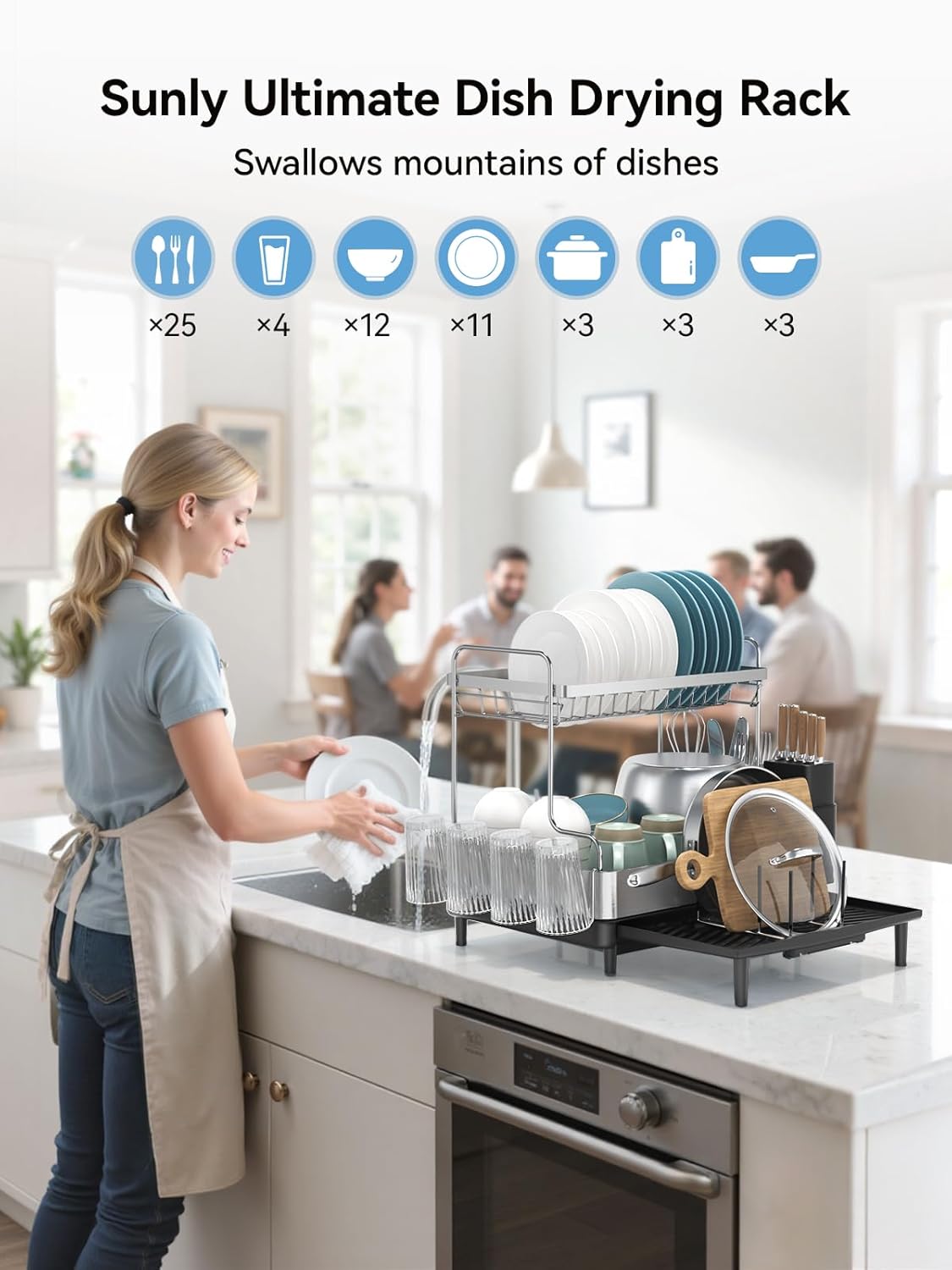 - [Larger Capacity & 2-Tier Design]: The Sunly Large 2-Tier Stainless Steel Dish Drying Rack measures 12.6”D x 22.48”W x 15.16”H, maximizing kitchen counter space for large families.