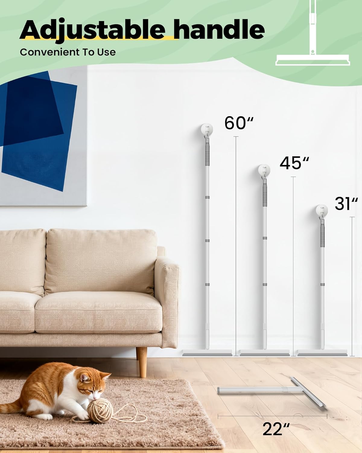 - 【4-in-1 Adjustable Pet Hair Remover Set】 Includes a 60" adjustable pet hair removal rubber broom, pet hair remover, pet hair removal glove, and electrostatic hair removal gloves. This dog and cat hair remover for carpet set easily cleans hair under sofas, beds, and furniture crevices. The soft rubber bristles effectively adsorb hair without damaging surfaces, making it a versatile broom for carpet, broom for dog hair, and even a dog hair remover for couch—perfect for carpets, hardwood, tiles, fabric sofas, car seats, and pet beds.
