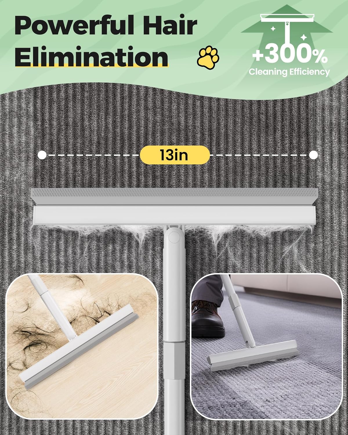 - 【A Time-Saving Cleaning Tool】 The 13" wide broom head quickly cleans hair on carpets over large areas. Paired with the included scraper, it deeply cleans corners—no extra tools needed for disassembly. Just switch functions to tackle different scenarios, efficiently achieving a hair-free home with this animal hair remover for carpet.