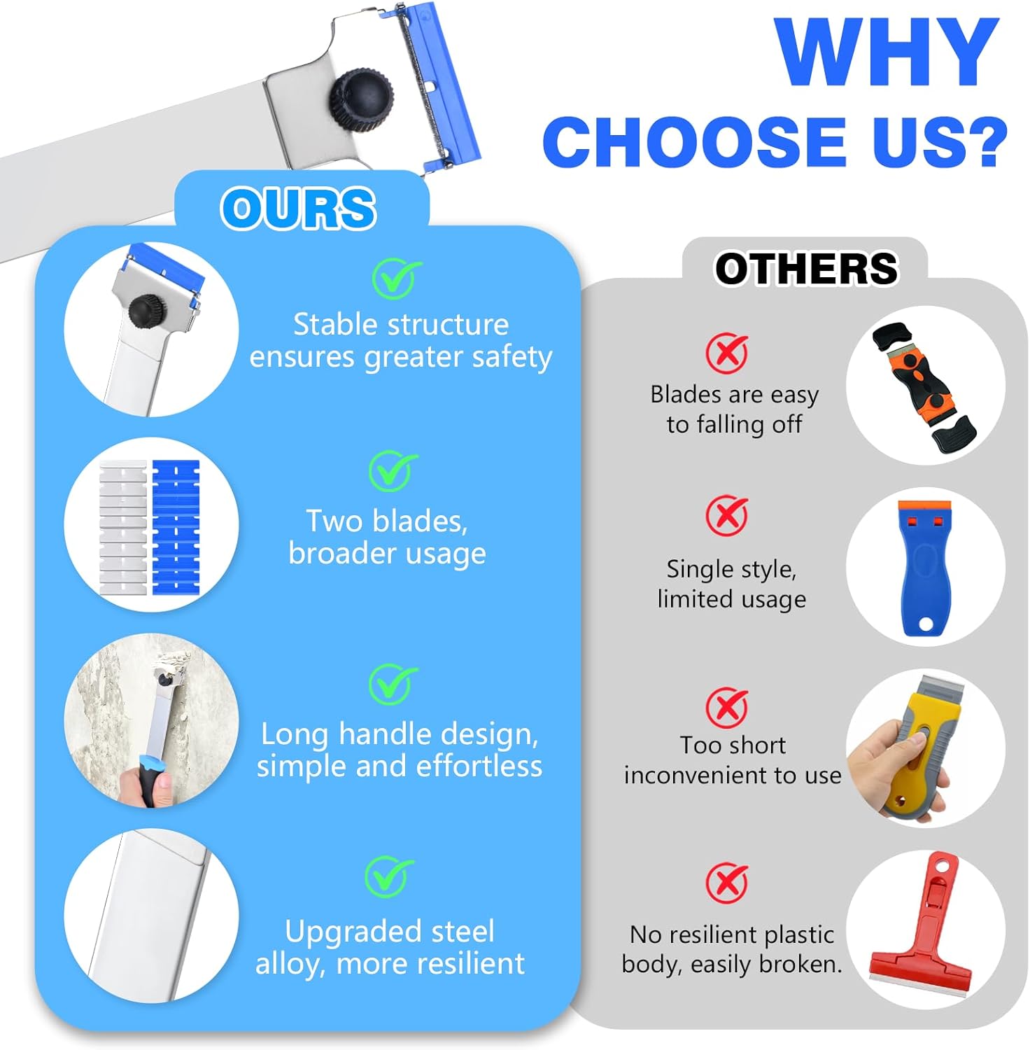 - Set Contents - Our razor scraper tool includes a long handle razor blade scraper tool, with 10 extra replacement metal scraper blades and 10 plastic razor blades. A large number of replacement blades make you worry-free.
