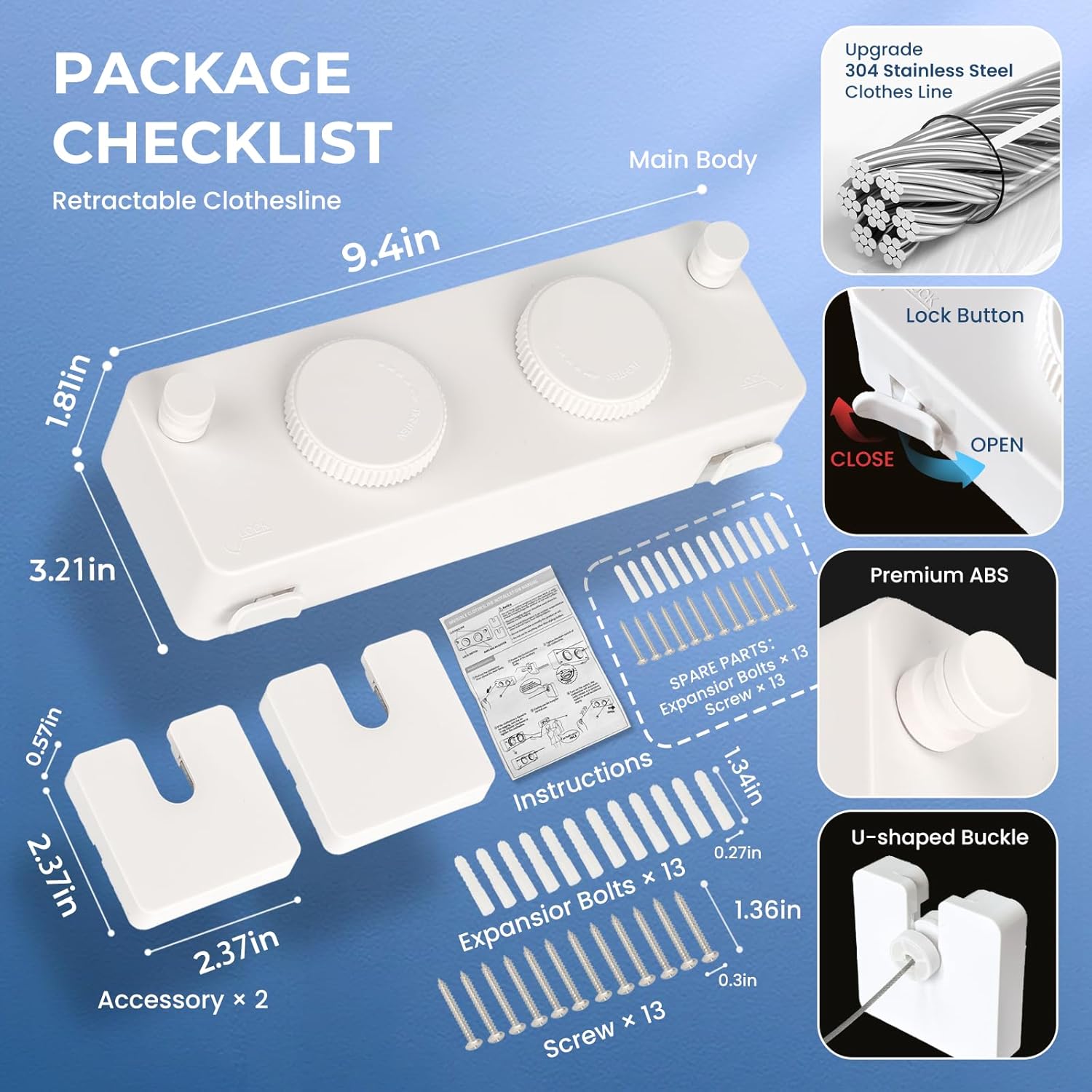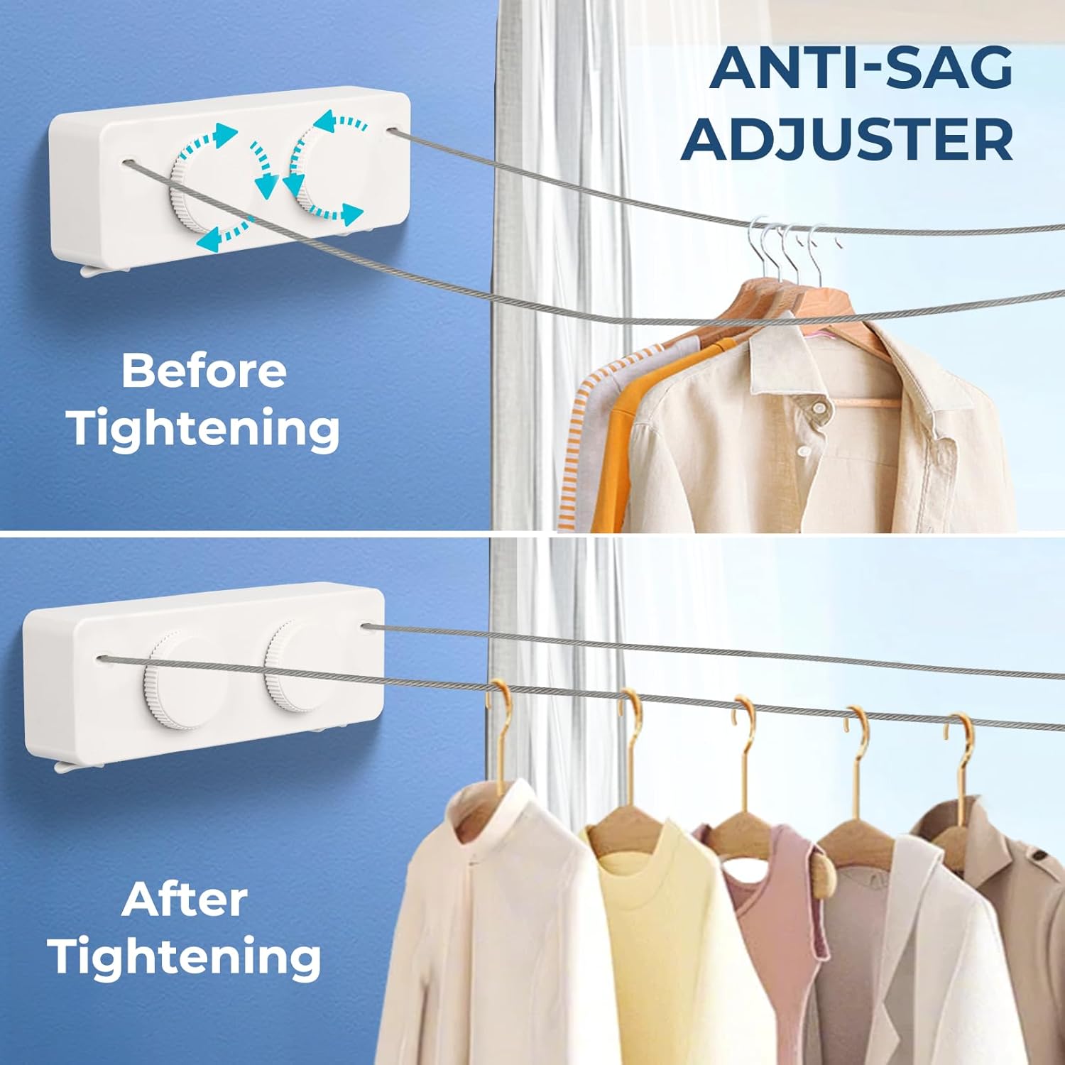 - 【Retractable Clothesline Indoor Outdoor Heavy-Duty】 Upgrade 304 Stainless Steel Clothes Line anti-sag design supports Single rope 40lb double rope use 70lb . Features a knob-locking mechanism for stable drying of heavy items like Outdoor Drying Rack Clothing blankets and jeans.