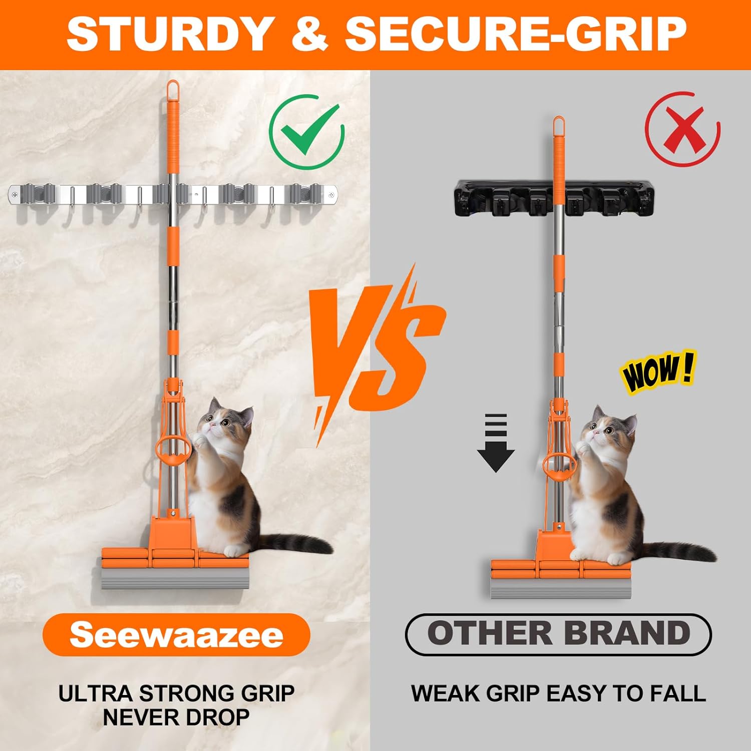 - 【Effortless Tool Handling & Capacity】Designed for ultimate convenience, this broom and mop holder features flexible grippers that easily accommodate handles of various sizes. Simply push your mop or broom handle into the clips after cleaning – no fuss. The wall mount for brooms and mops utilizes sturdy broom hooks wall mounted and a mop wall holder system. This broom mop holder has a total weight capacity suitable for household and garage tools, making it a practical broom and mop organizer wall hanging.
