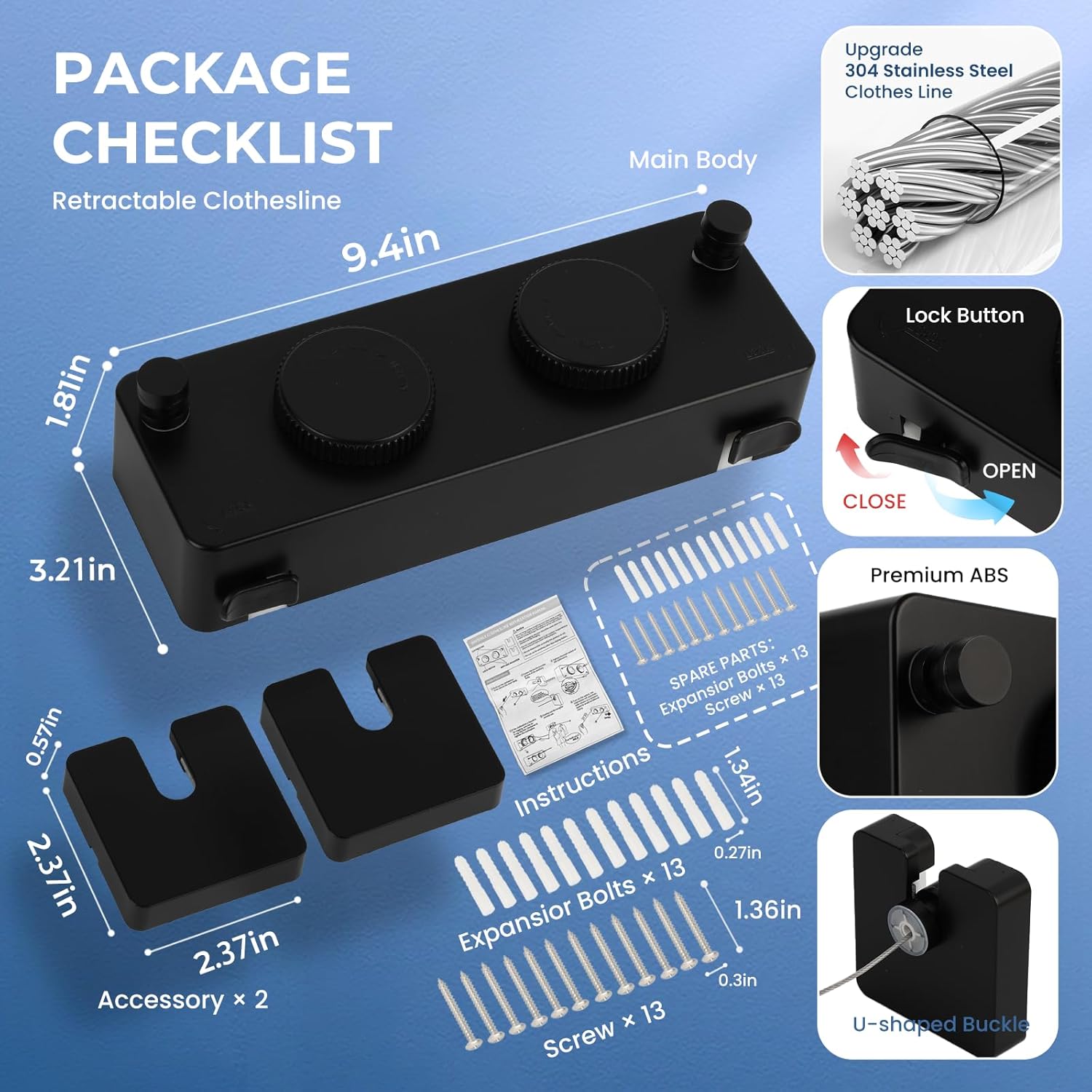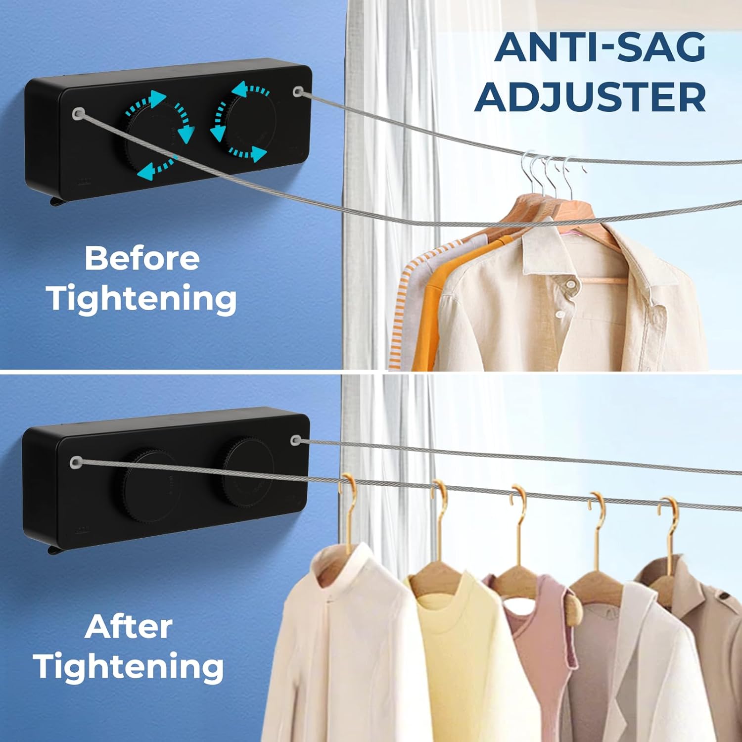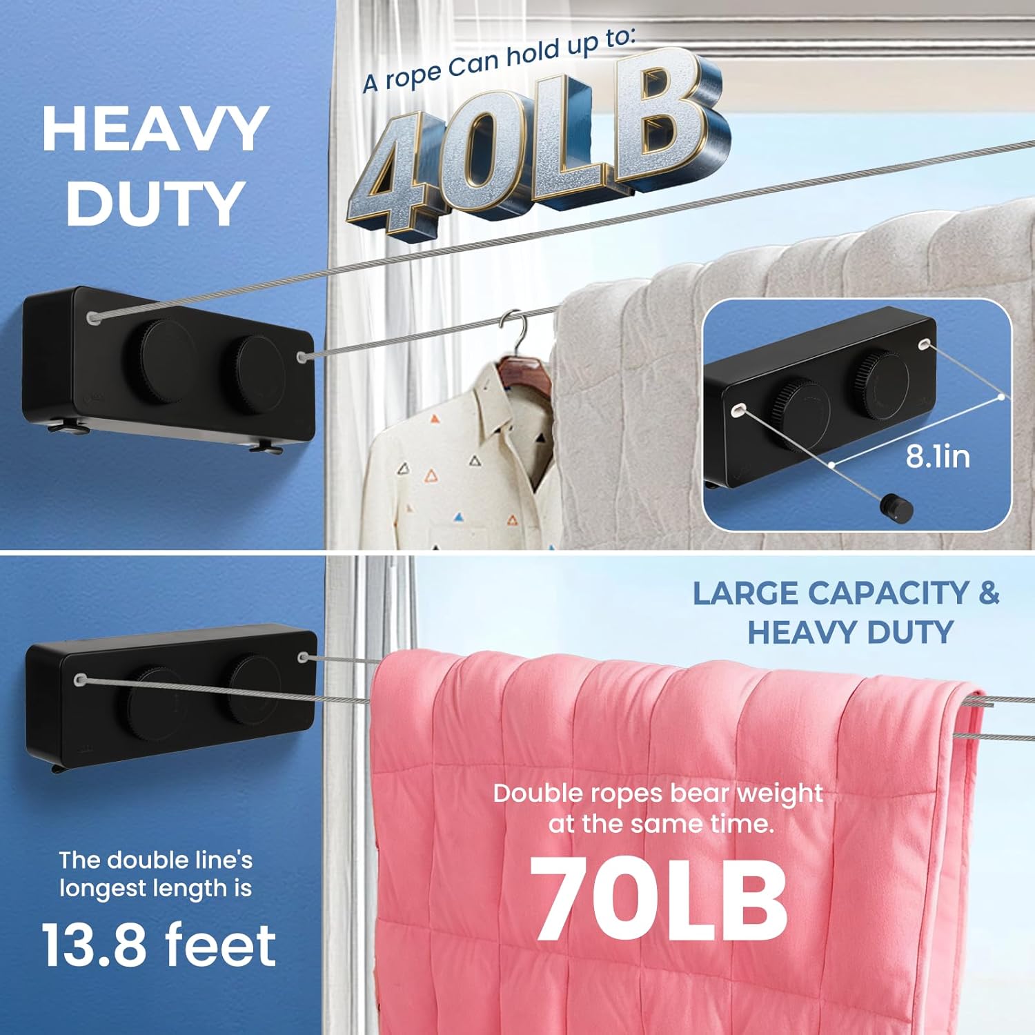 - 【Retractable Clothesline Indoor Outdoor Heavy-Duty】 Upgrade 304 Stainless Steel Clothes Line anti-sag design supports Single rope 40lb double rope use 70lb . Features a knob-locking mechanism for stable drying of heavy items like Outdoor Drying Rack Clothing blankets and jeans.