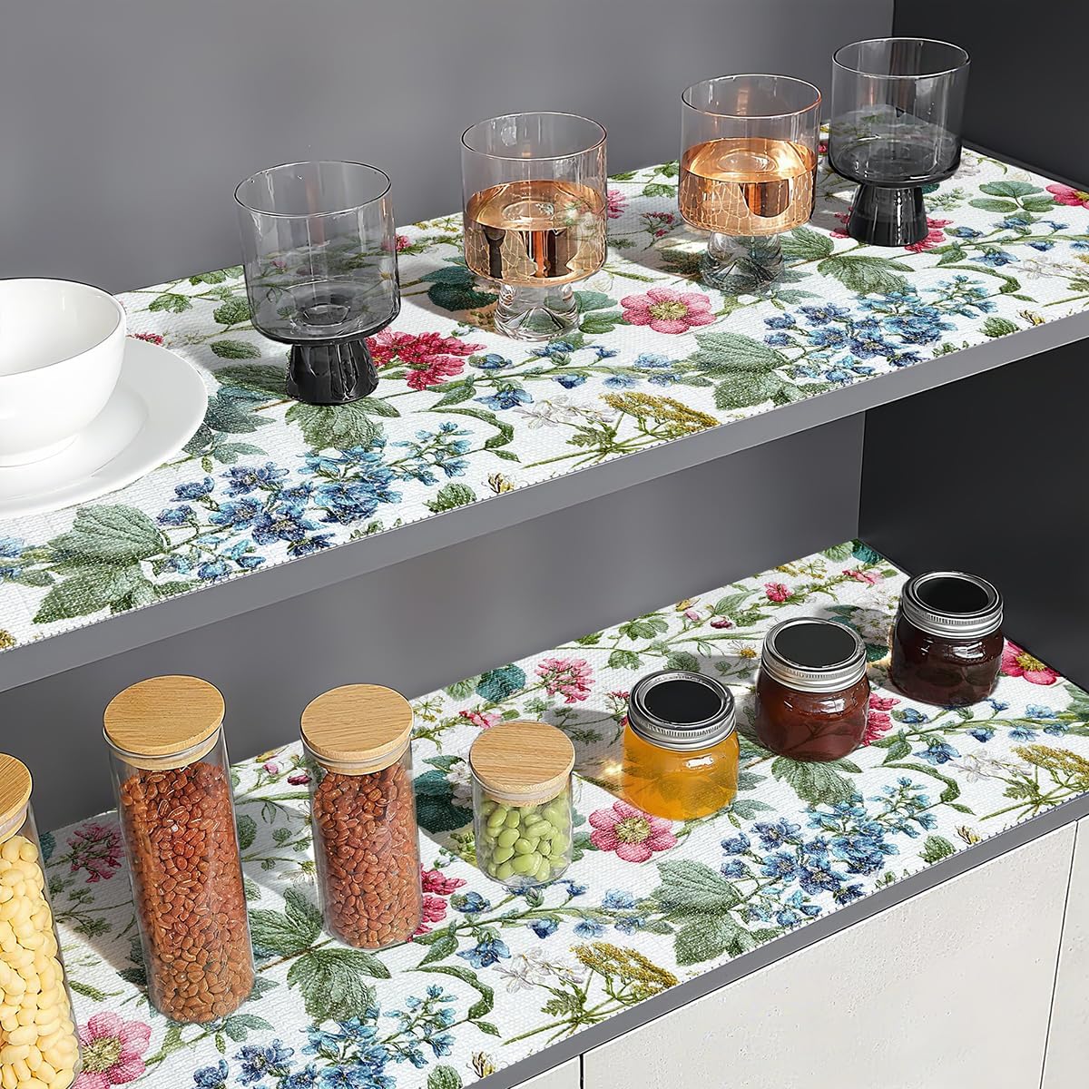- Emerald leaves and blush-pink blossoms intertwine, printed on a non-slip drawer liner that adds a touch of landscape to your kitchen. If an odor is present upon opening, it will dissipate after being placed in a well-ventilated area for a short time.