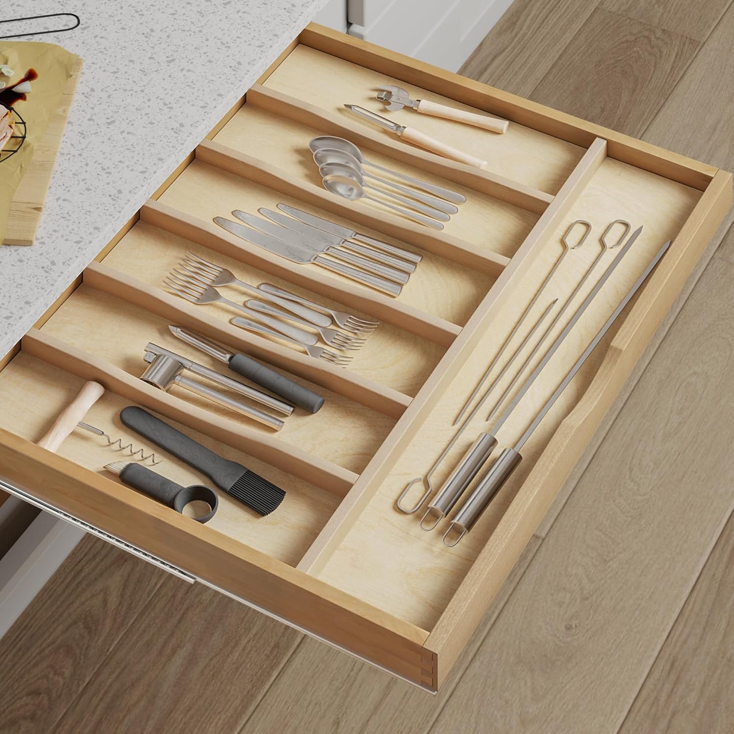 - ăPremium Solid Birch Woodă Crafted from 100% natural birchwood, this silverware drawer organizer is built to last. The smooth, clear-coated finish resists moisture. Upgrade your kitchen storage with our cutlery tray organizer in drawer.