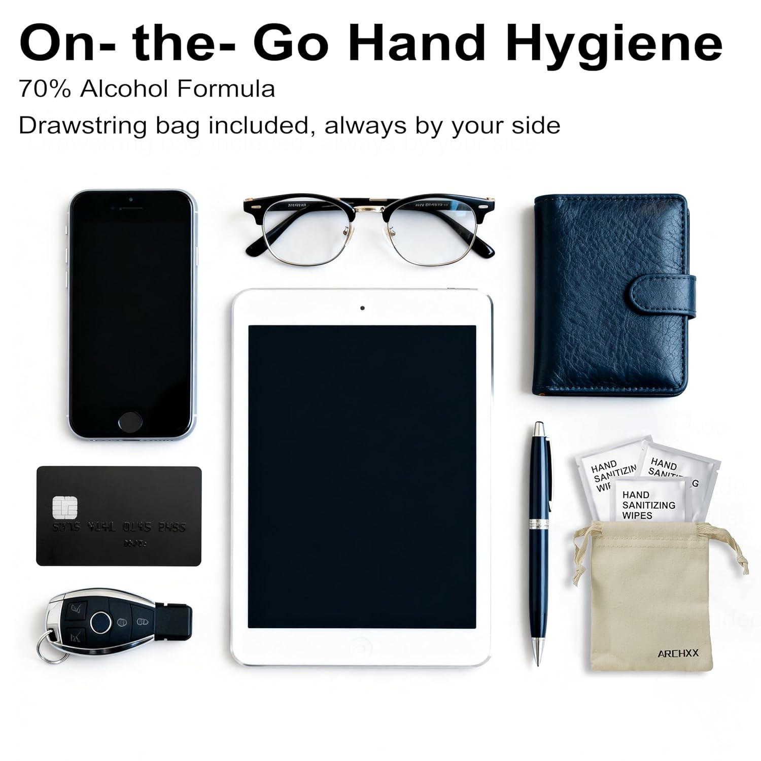 - On-the-Go Hygienic β Compact and portable alcohol wipes, individually sealed for safe hygiene. Ideal as hand sanitizer for school and a practical hand sanitizer travel size option, a travel wipes perfect for daily use in the car, office, gym, and while commuting. All rinseβfree, no water needed