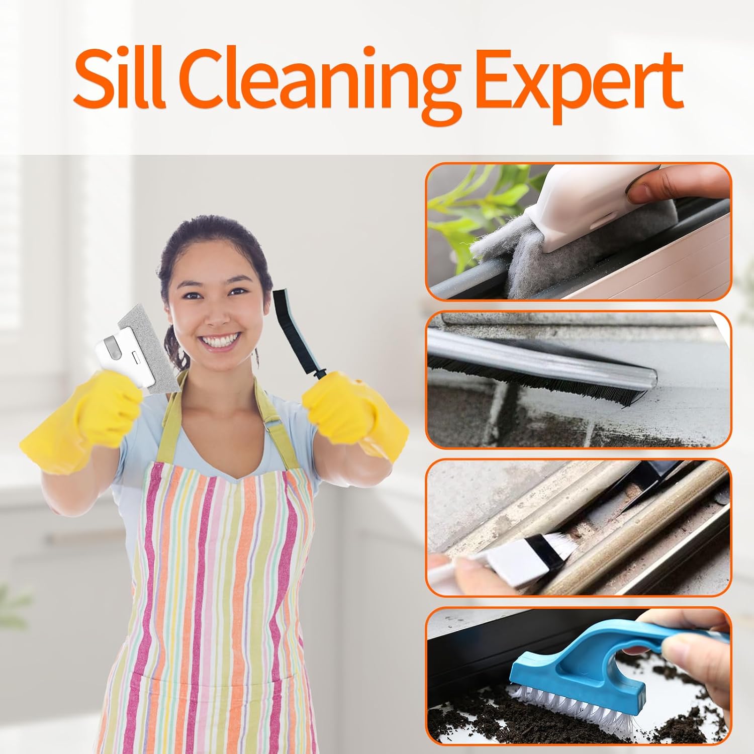 - 11PCS WINDOW CLEANING KIT - 11 specialized tools tackle every corner of your window door! Includes:3 Magic window cleaning tools​with 2 extra replaceable heads, 2 Gap brushes​for tight spaces, 1 Swan-shaped track brush with ergonomic grip and 2 small crevice brushes. Perfect for home: Window, door tracks, tile, floors, shutter, vents, and more!