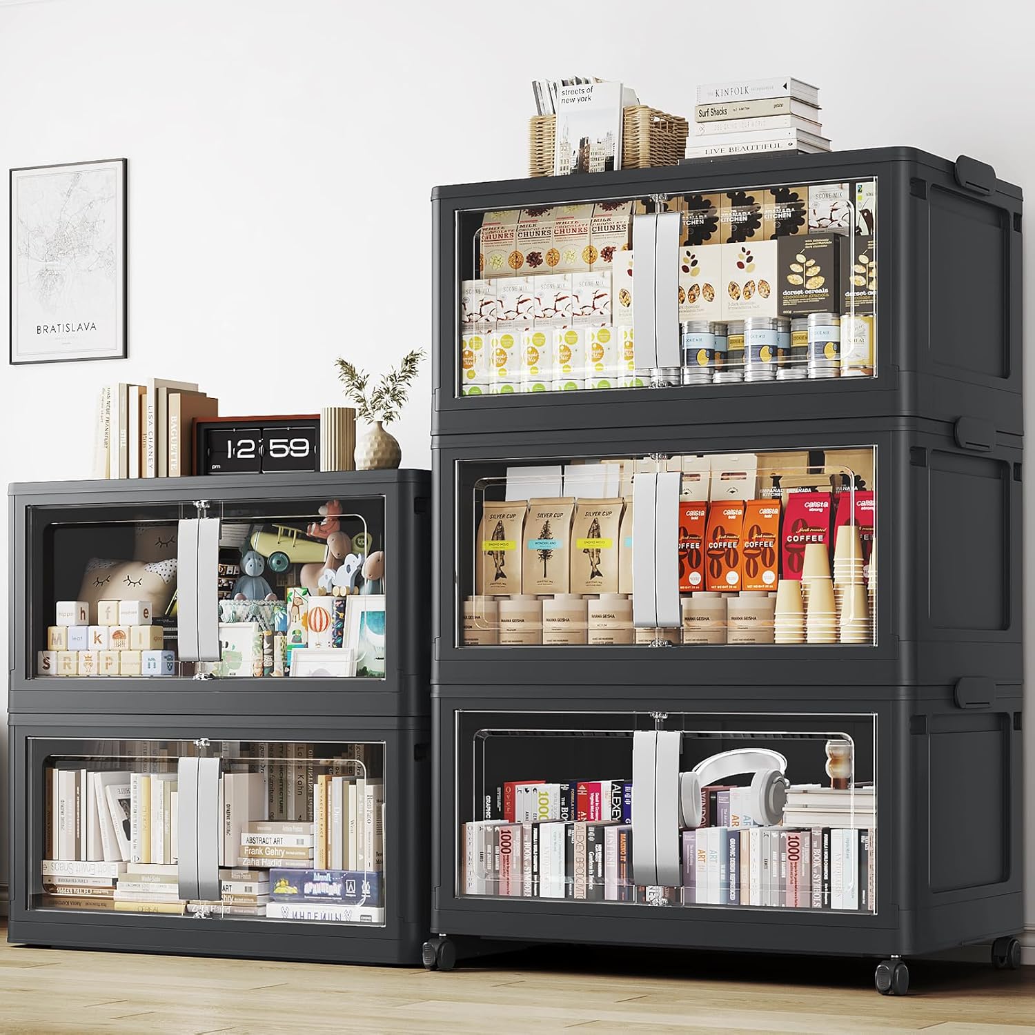 - 【Super Clear Doors & Ease Access】Stackable storage bins with doors open front features super clear PET doors for instant content viewing at a glance. Enjoy effortless one-handed access with the oversized ergonomic handle and secure magnetic closure. Sleek and modern folding storage bins with lids seamlessly complements any contemporary home decor