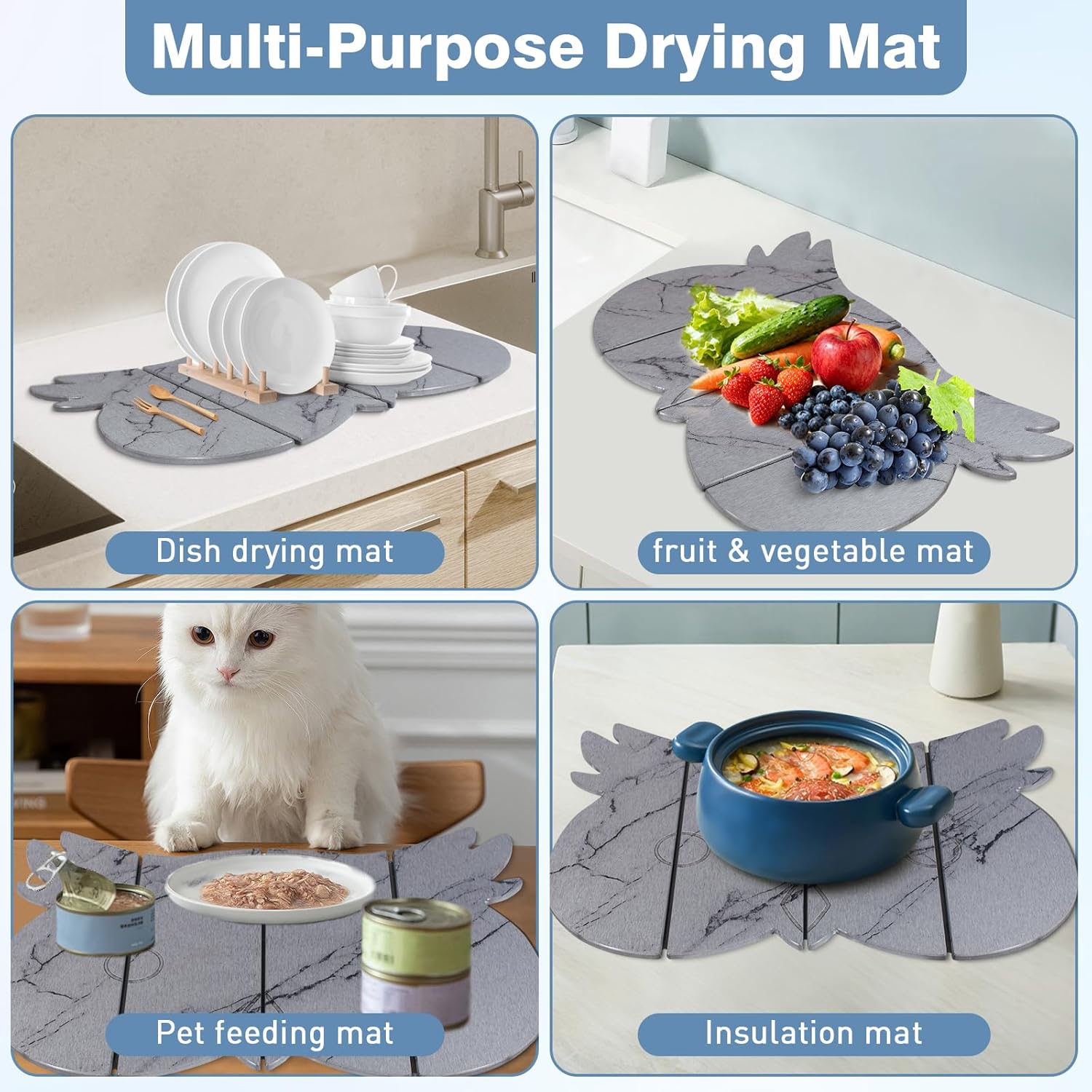 Large Stone Dish Drying Mat for Kitchen Counter,24"(L)×16"(W) Quick Dry Absorbent Diatomaceous Earth Dish Drying Mats,Owl Shape Design Drying Pads for Cups Dishes Bottles (Gray)