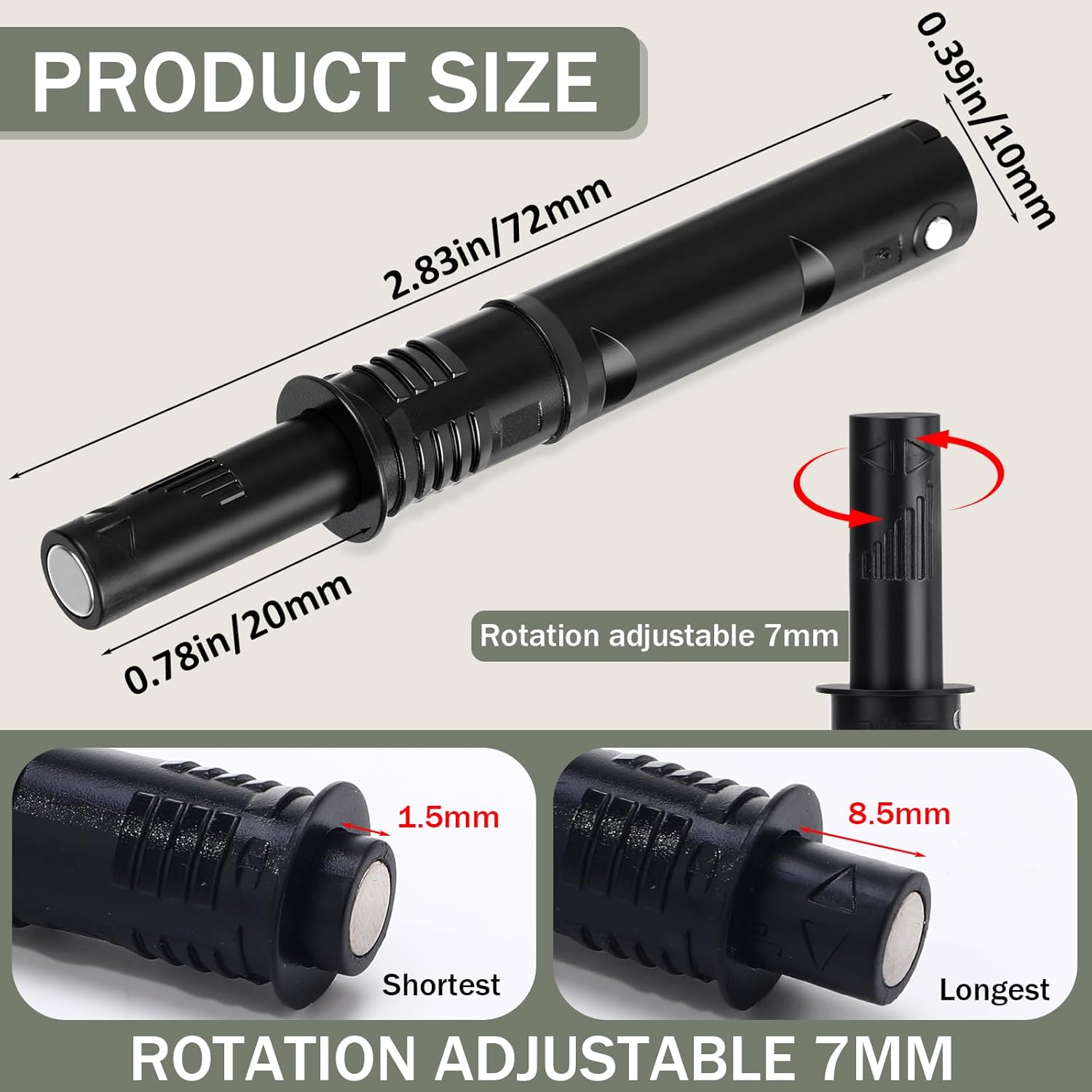 - Easy DIY Installation: each magnetic cabinet latch includes mounting screws; Attach the magnetic base to the cabinet frame and the strike plate to the door or drawer; By rotating, the distance of the rebounder's pop up stroke can be fine tuned to make the rebounder suitable for different door gap distances