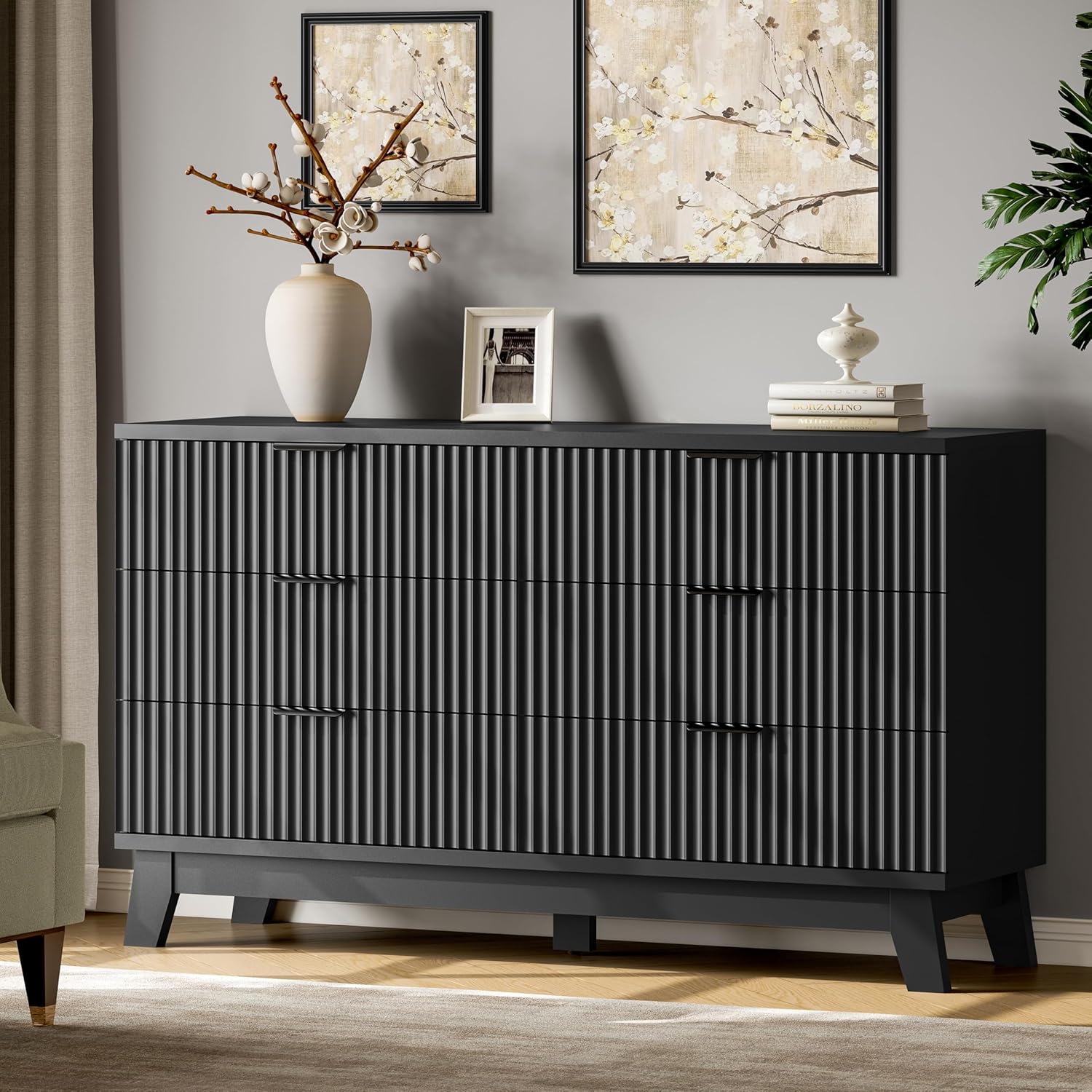 Fluted Dresser with 6 Drawers, 54" Wide Modern Chest of Drawers with Metal Handle, Wooden Dresser TV Stand, Wood Closet Clothes Storage Organizer for Bedroom, Living Room, Hallway, Solid Black